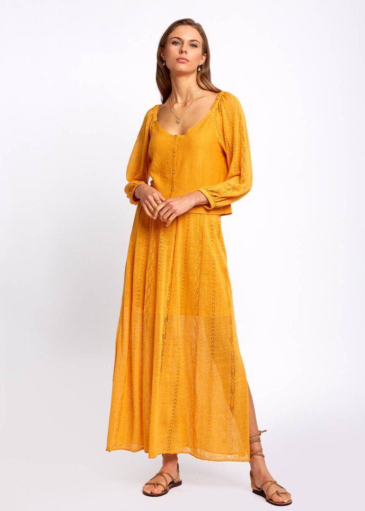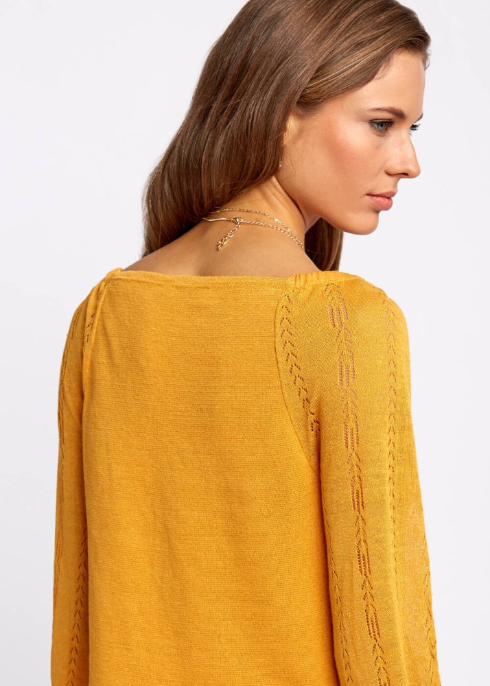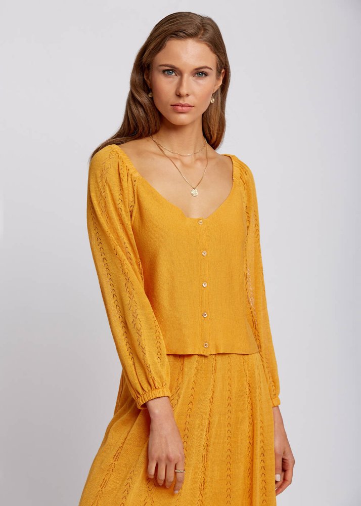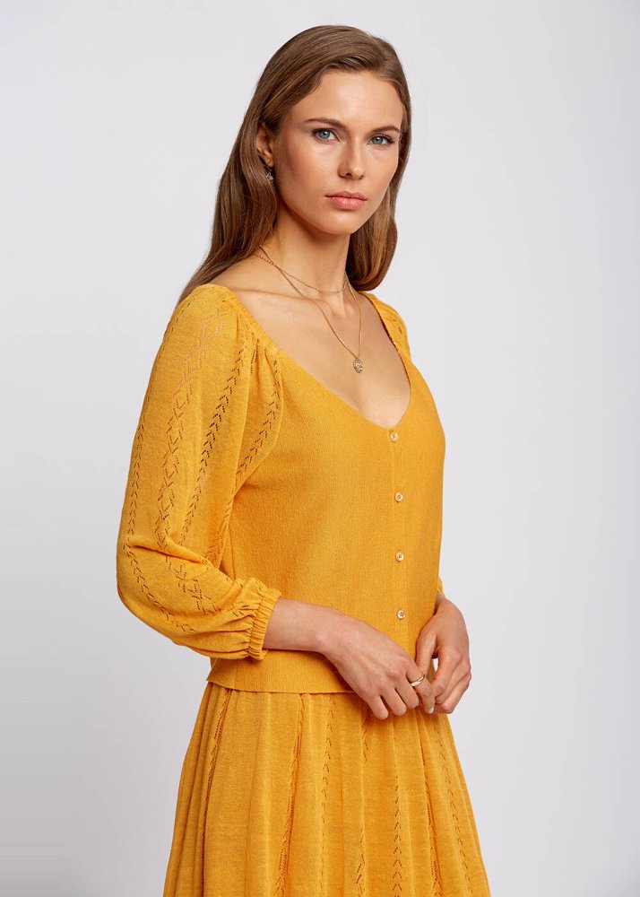 Knitss triko üst, canlı turuncu rengi ve ajur örgü detayları ile hayranlık uyandırır. Düğmeli triko üst, kollarındaki büzgü detayı ve içerdiği keten karışımı ile yaz kombinlerinize şıklık ve konforu bir arada sunar. Koleksiyonun diğer parçaları ile kolaylıkla kombinleyebileceğiniz kadın triko üst, takımı olan Naomi Skirt mükemmel bir uyum içerisindedir. Keten karışımlı triko üst, business ve günlük kombinleriniz için idealdir.