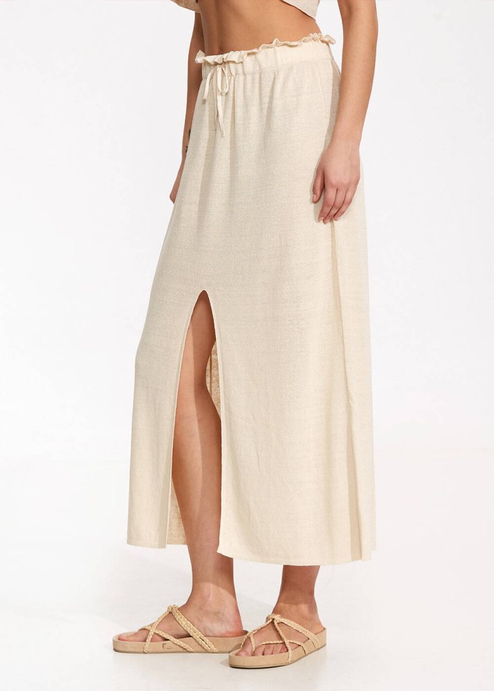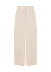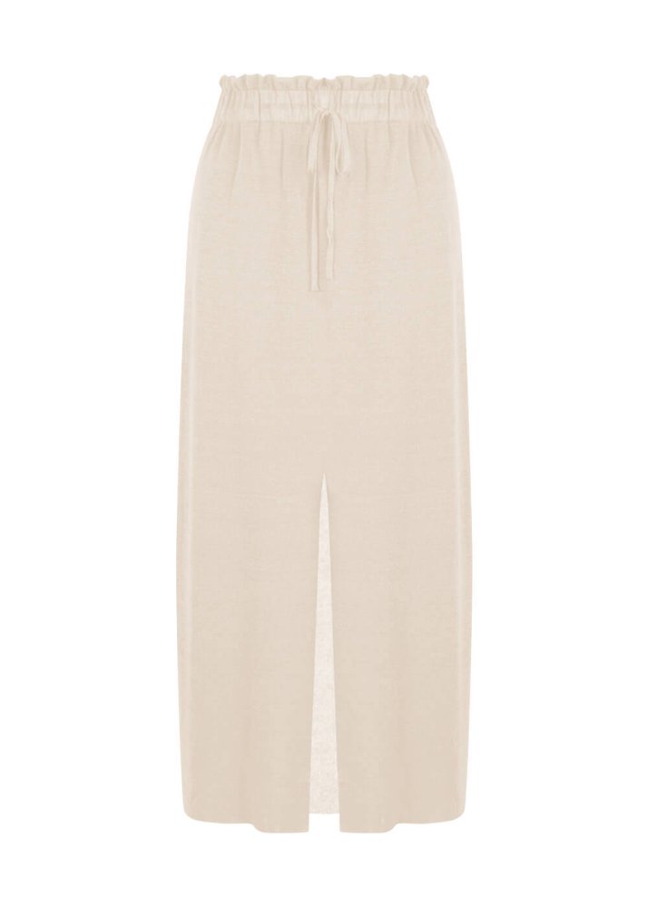 Bej renkli triko etek, önden yırtmaç ve belden lastik detayıyla şık ve konforlu bir giyim deneyimi sunar. Triko etek modeli, sürdürülebilir yöntemlerle birinci sınıf İtalyan ipliklerinden üretilmiştir. Business, günlük ve sahil stilinize kolaylıkla uyum sağlayacak uzun bej triko etek, koleksiyonda yer alan diğer parçalarla birlikte kombinlemeye uygundur.