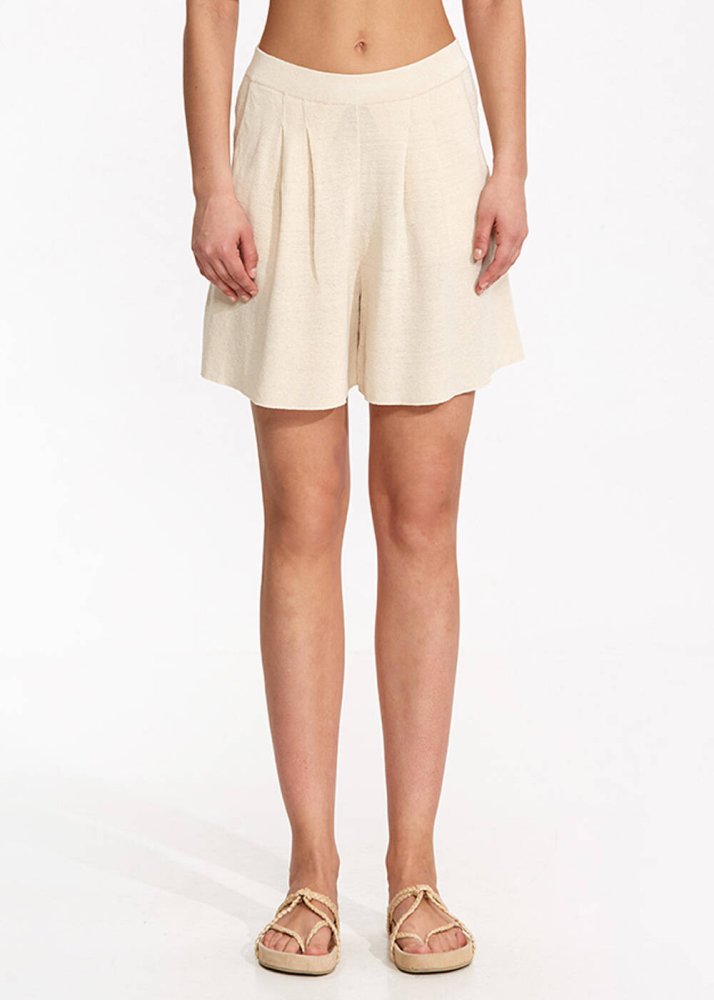 Konforundan ödün vermeden şık olmayı bilen Knitss kadınları için üretilen pileli kum rengi triko şort, keten içeriği ile ayrıcalıklıdır. Nefes alan ince yüzeyi ve serinlik hissi veren soğuk tuşesi ile yazlık sürdürülebilir elyaflar arasında en değerlilerden ketenin başrol oyuncusu olduğu bu şık şort, pileli modeli ve rahat kesimi ile çağdaş kadın kombinleri için ideal bir parçadır.