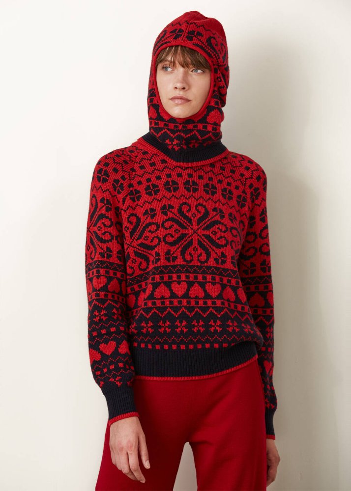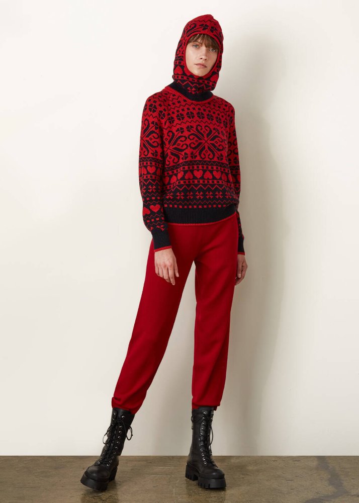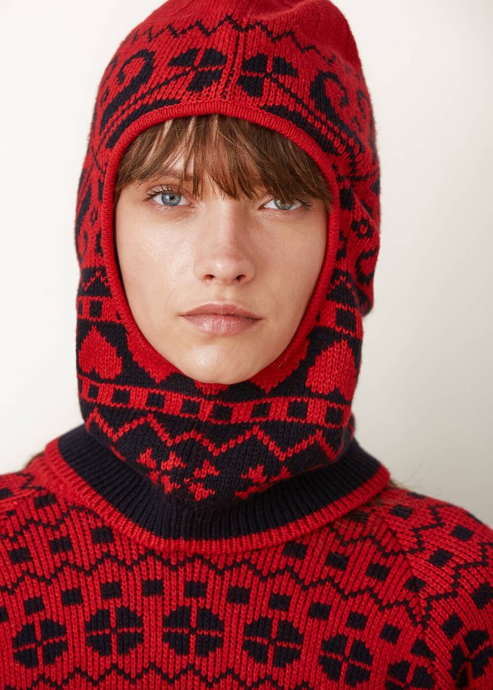 Kırmızı & lacivert yün bere, kışa özgü desenleri ile Knitss kadınının kayak stiline rahat ve şık bir görünüm sunar. Takımı olan Whistler Sweater ile kombinleyebileceğiniz balaclava modeli, soğuk kış günlerinde harika bir koruyucudur.