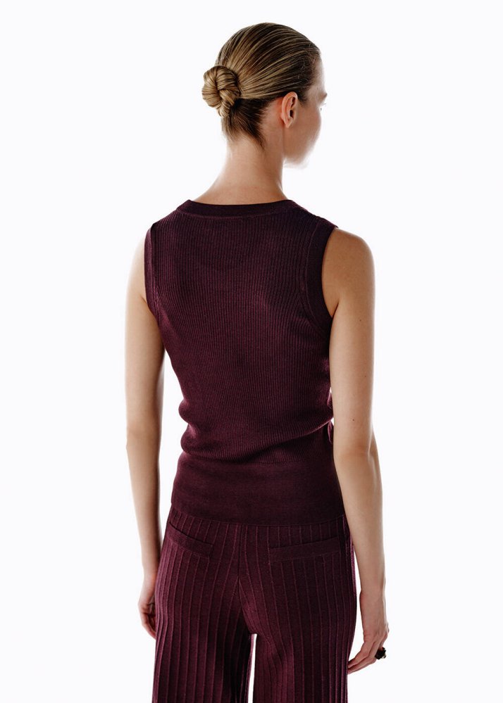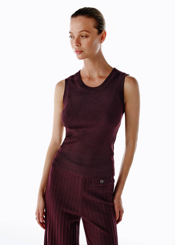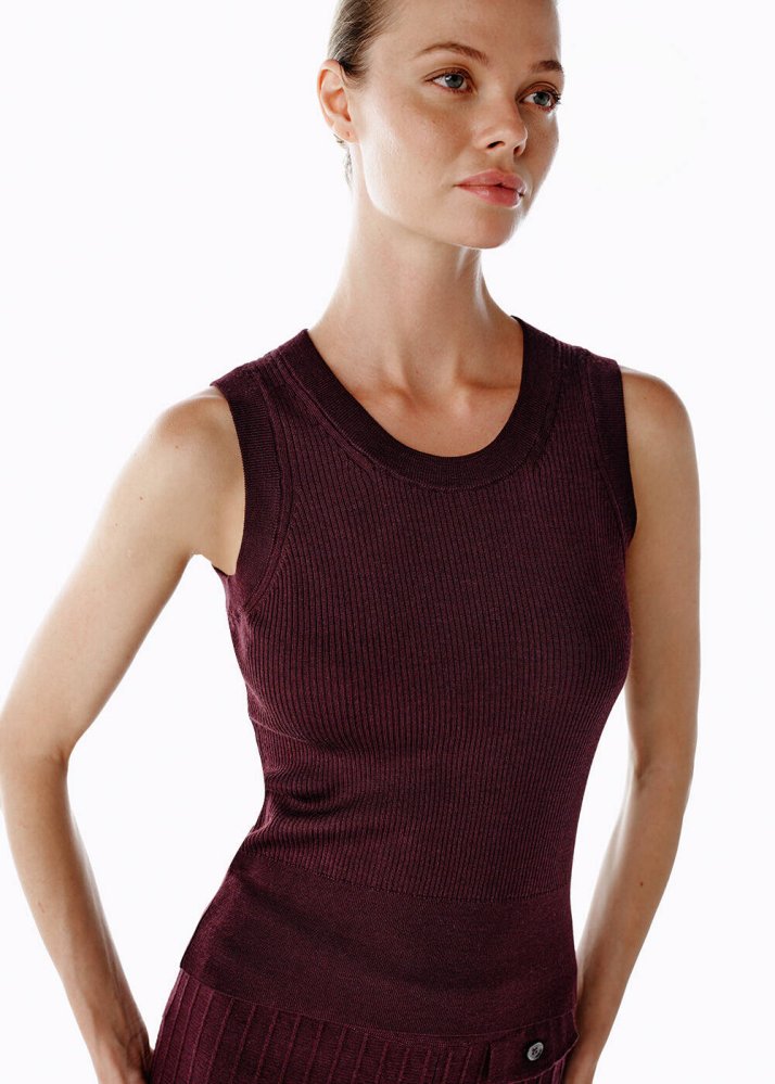 Mor tonuyla göz alıcı bir duruş sunan bu kolsuz extrafine merino yün karışımlı triko üst, İtalyan ipliğinin yumuşak dokusu ve %75 yün, %25 Lyocell içeriği sayesinde hem konforlu hem de lüks bir his verir. Hafif yapısı, cilde nefes aldıran formu ve sade tasarımıyla sezonun en kullanışlı parçalarından biridir. Aynı renkteki triko pantolon, etek veya ceketlerle kombinlendiğinde kusursuz bir bütünlük oluşturur