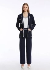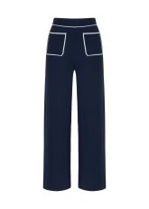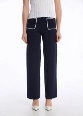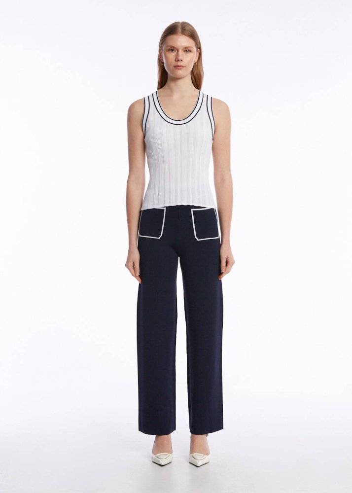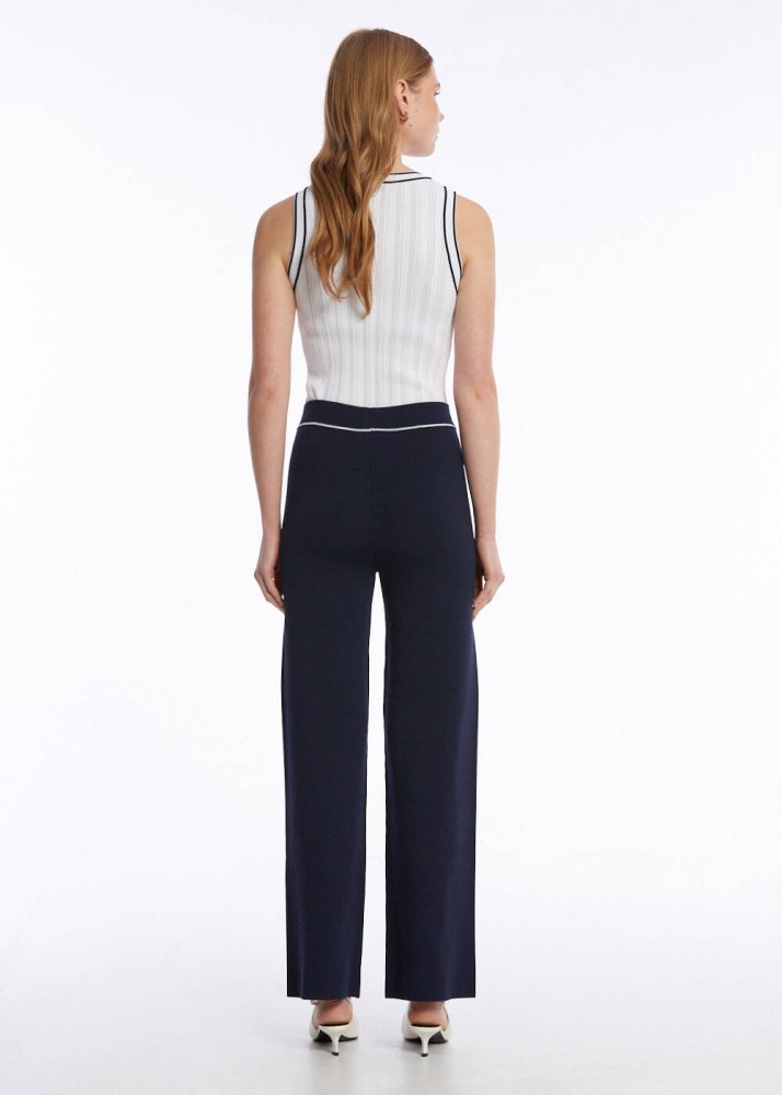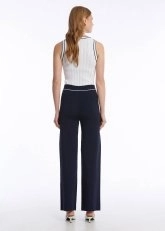 Beyaz çizgi detayları ile çağdaş grafiksel bir tasarım diline sahip lacivert triko pantolonu keşfedin. Konforlu, şık ve sofistike yazlık kadın giyimi için ideal bir parça olan lacivert triko pantolon, spor-şık kombinlere zahmetsizce uyum sağlar. Takımı olan triko ceket ve triko üstle bütünlüklü bir tarz sunan, stil sahibi bir parçadır.