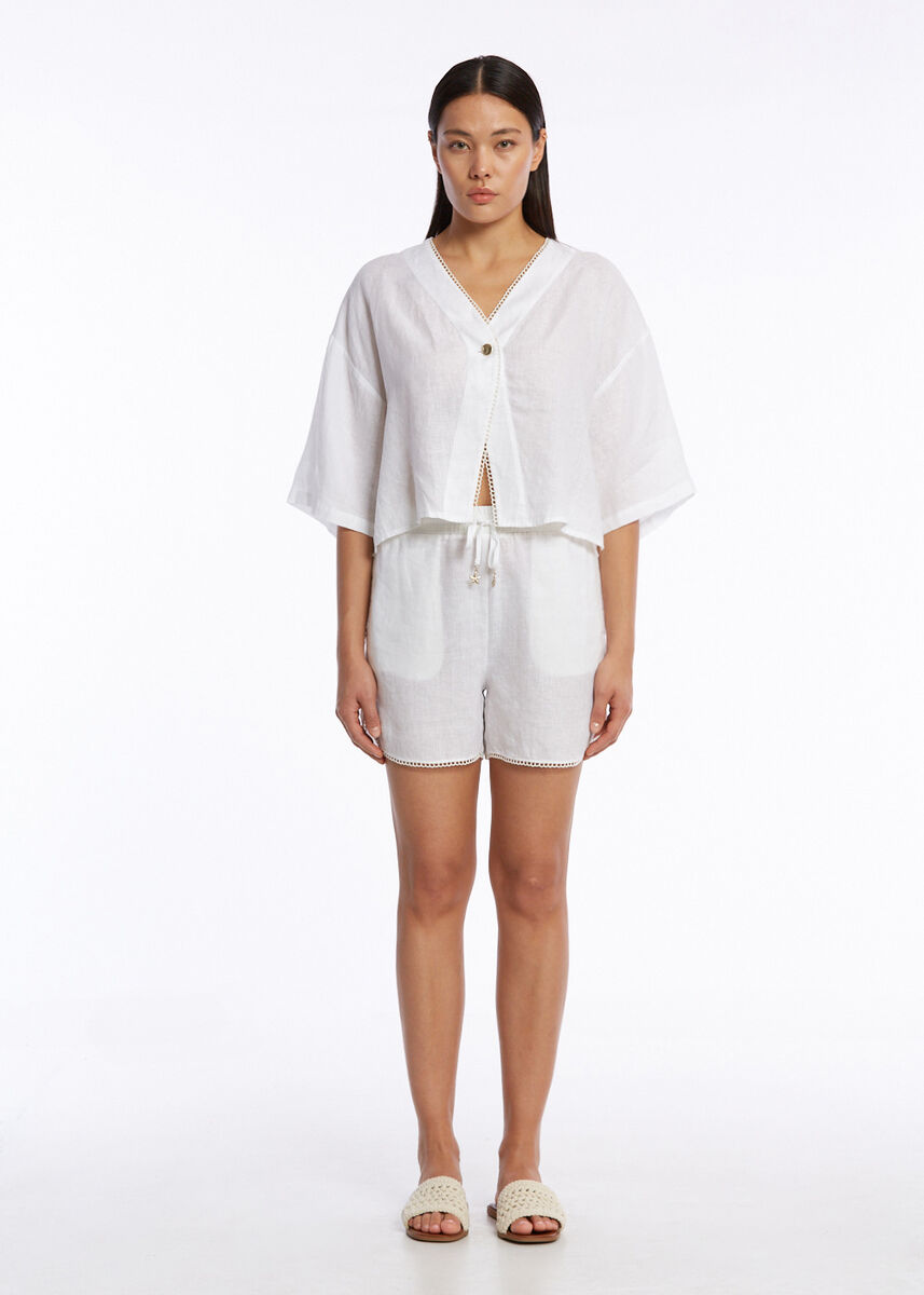 Kontrast Detaylı Beyaz Keten Şort