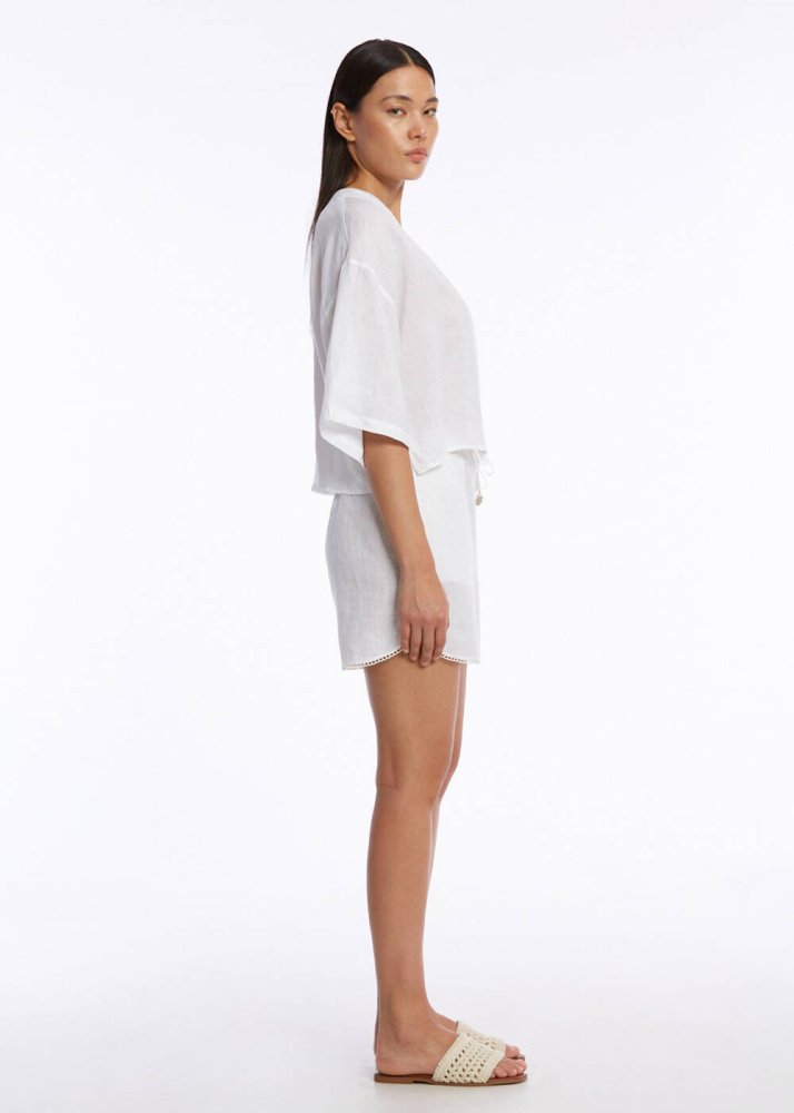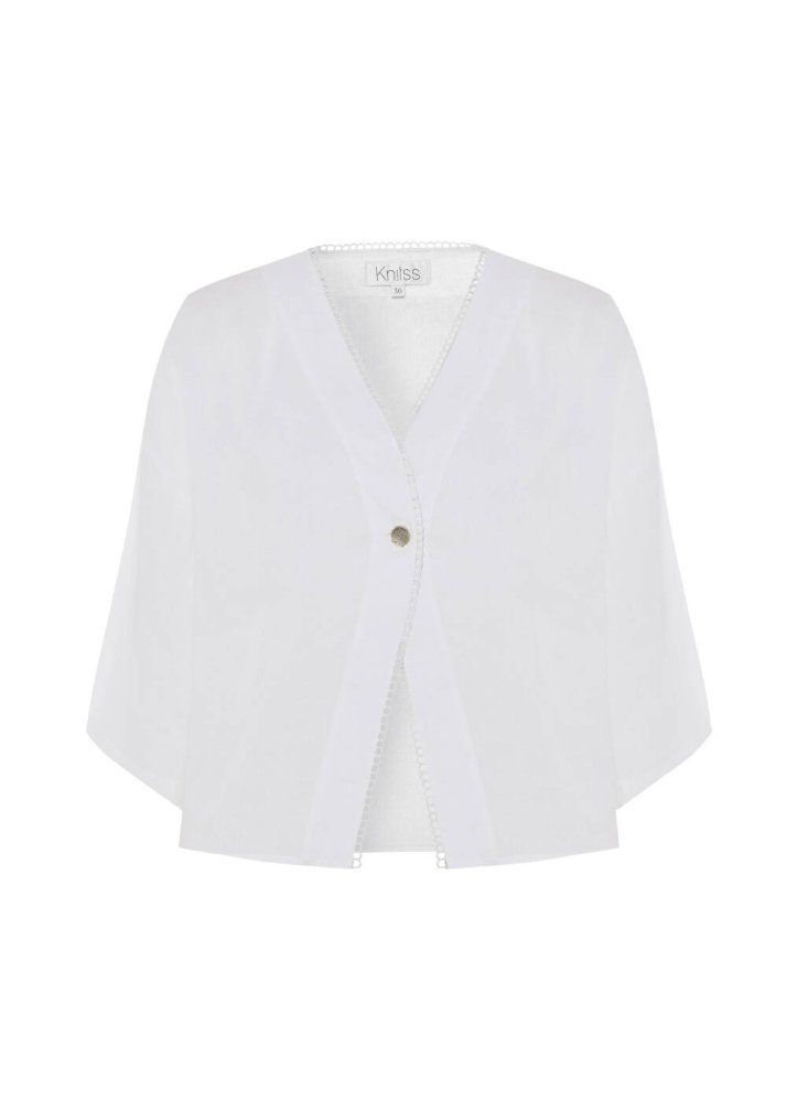 Doğal ketenin eşsiz ferahlığını zarif kontrast detaylarla buluşturan beyaz keten üst, yaz stilinize hafif ve şık bir dokunuş katmaya hazır. Beyaz zemin üzerinde özenle işlenmiş kontrast şeritler, geniş kesimi gün boyu özgür ve rahat hissetmenizi sağlar. Keten kumaşının doğal serinliği sayesinde sıcak havalarda dahi konforunuzdan ödün vermezsiniz. Bu özel tasarım, hem rahatlığı hem de stil sahibi görünümü bir arada arayanlar için ideal bir seçimdir.