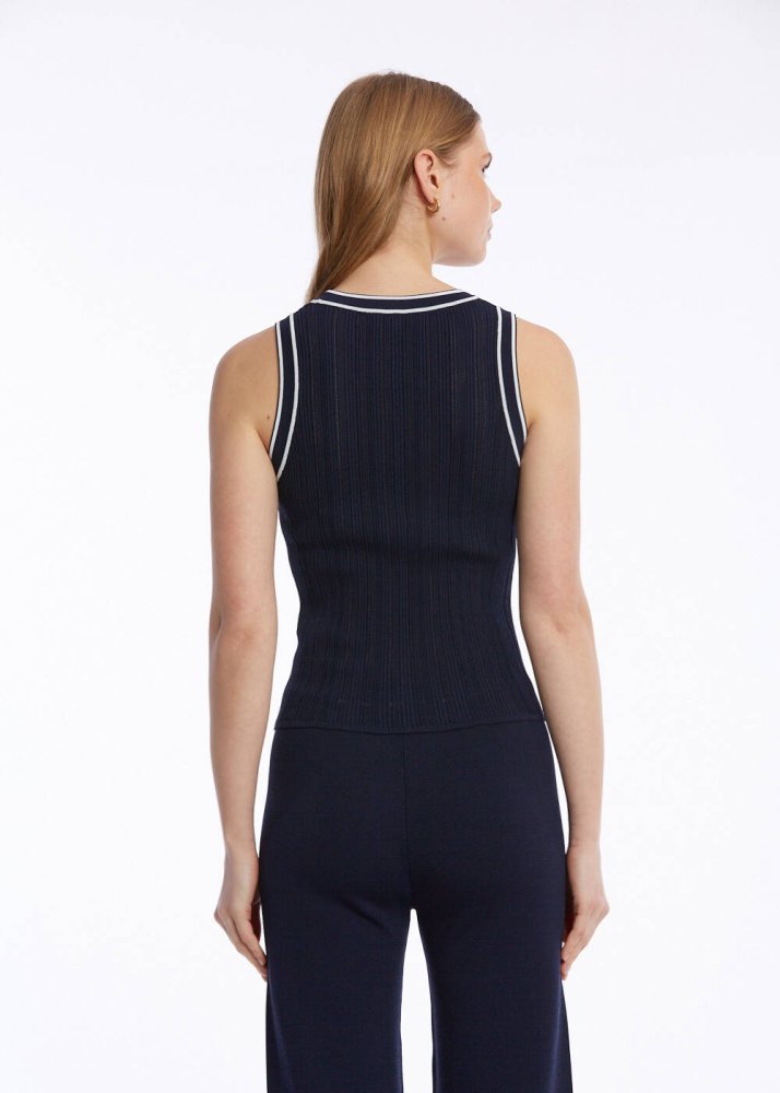 Beyaz çizgi detaylı kolsuz lacivert triko üst, Knitss’in konforlu ve şık çağdaş stilini yazlık kadın kombinlerine zahmetsizce taşır. İtalyan ipliklerinden üretilen lacivert kolsuz triko üst, hafifliği ile yazlık giyim için ideal konfor sunar. Zarif triko işçiliği, kontrast renk kullanımı ve çizgisel tasarım dili ile hem spor hem şık kombinler için uygundur.