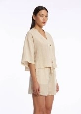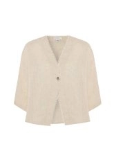 Gardırobunuzun vazgeçilmezi olacak kontrast detaylı bej keten üst, zamansız şıklığı deniz kabuğu düğmesinin benzersizliğiyle birleştiriyor. Her kombininize sofistike bir hava katacak bu özel detay, sıradanlıktan çıkarıyor.Beyaz ajur geçişleriyle modern bir dokunuş katarken, rahat kesimi sayesinde gün boyu konfor sunuyor.