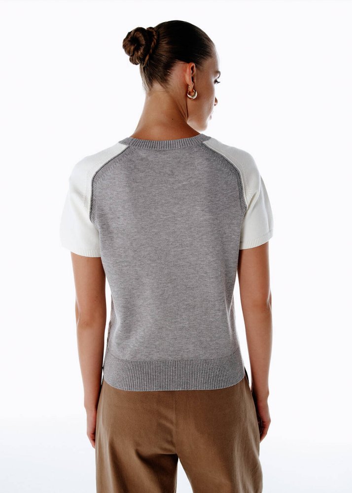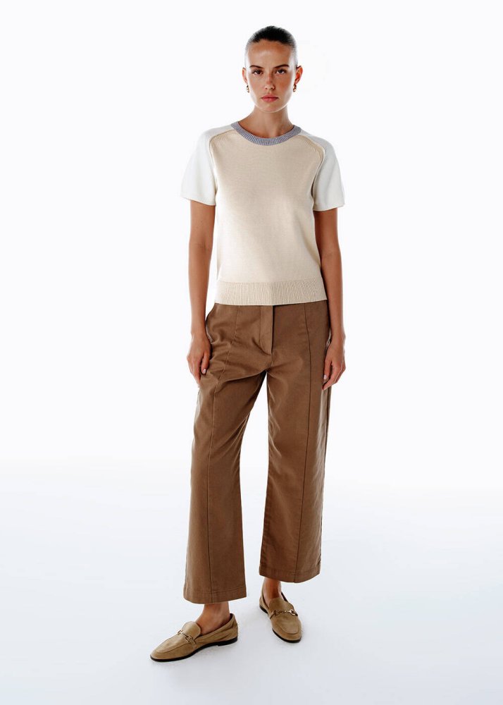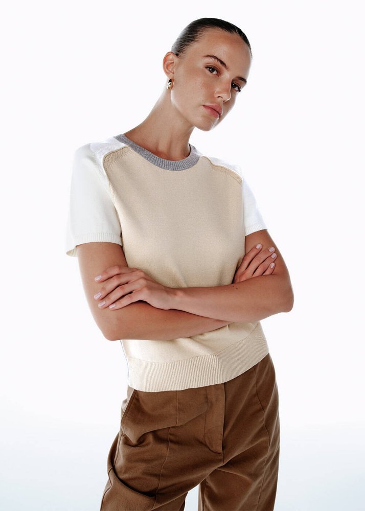 Ayrıntılarıyla fark yaratan bir parça. Kontrast detaylarıyla enerjik bir çizgiye sahip bu kısa kollu triko üst, İtalyan ipliğinin yumuşak ve kaliteli dokusuyla öne çıkıyor. Zamansız silueti, ince düşünülmüş kontrast çizgilerle birleşerek hem güçlü hem de zarif bir tavır ortaya koyuyor. İster şehirde enerjik bir gün geçirirken, ister hafta sonu rahat ve özenli bir görünüm ararken yanınızda olacak zamansız bir tasarım.