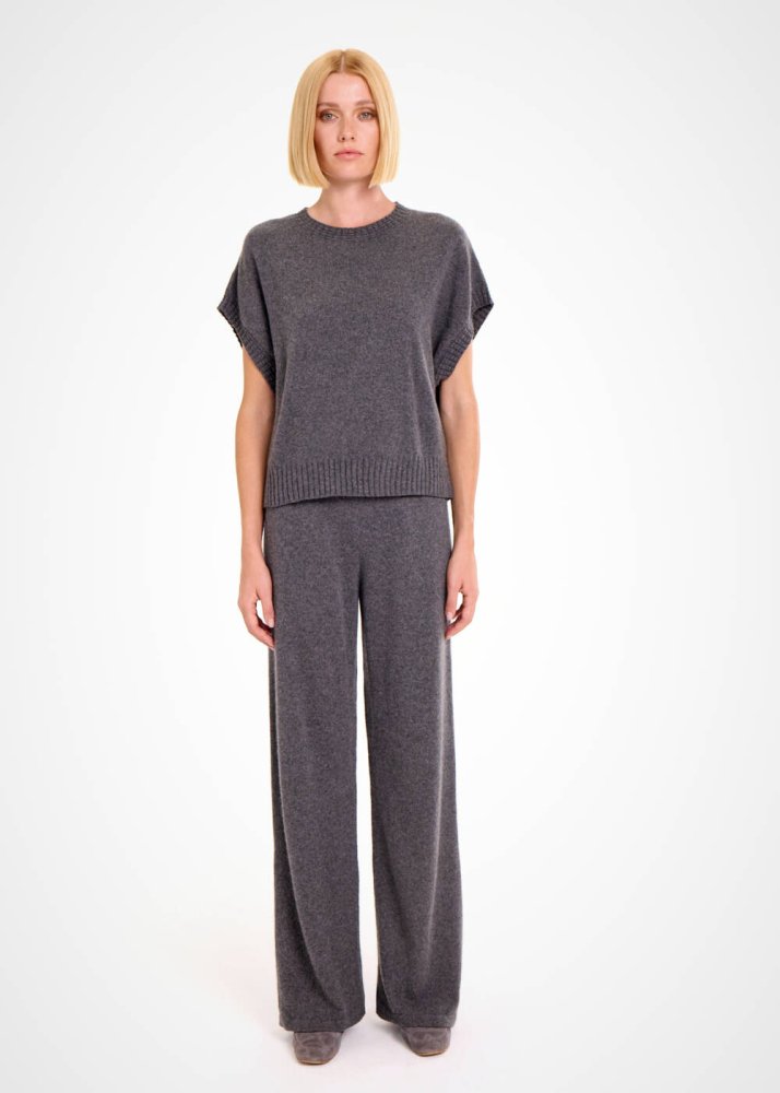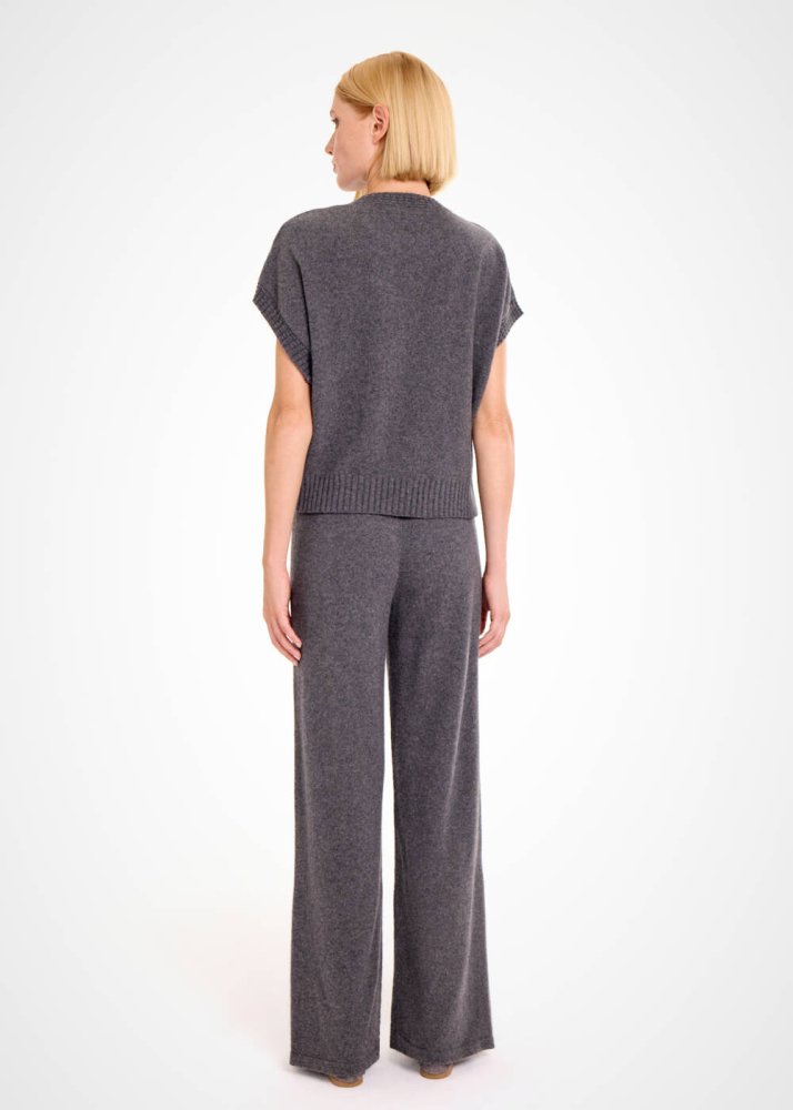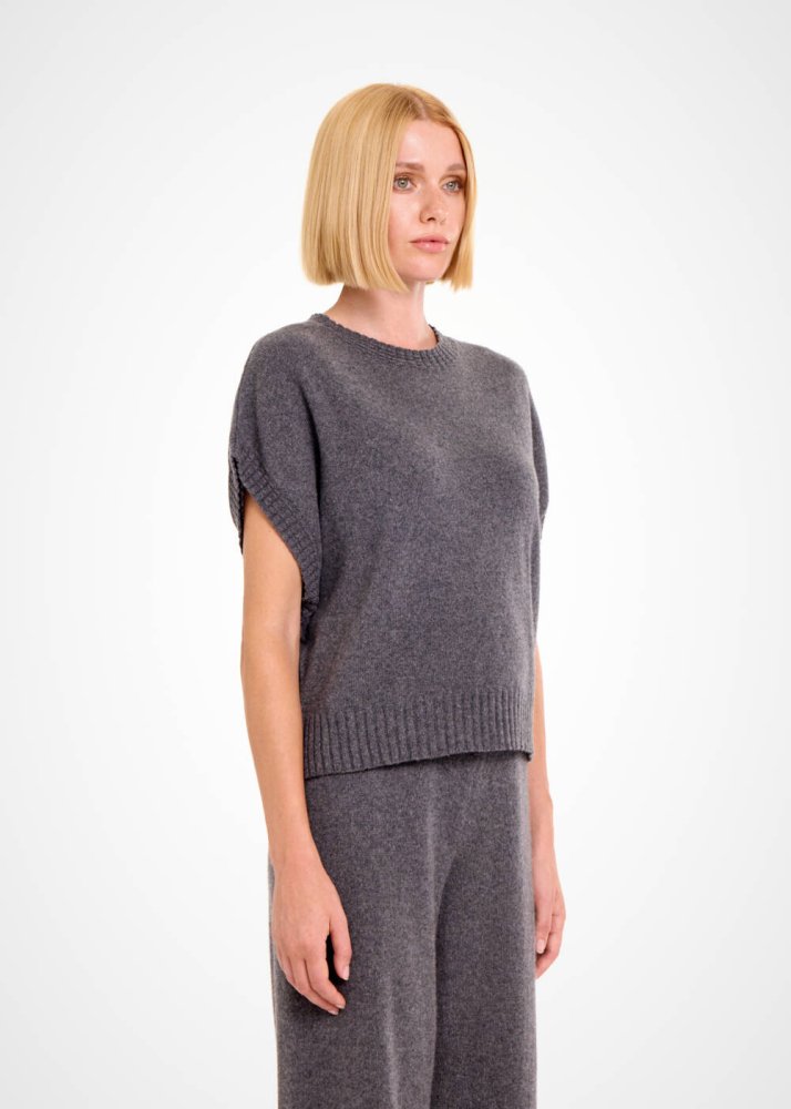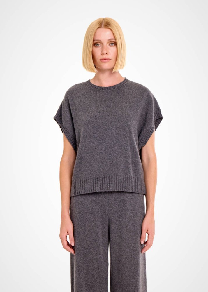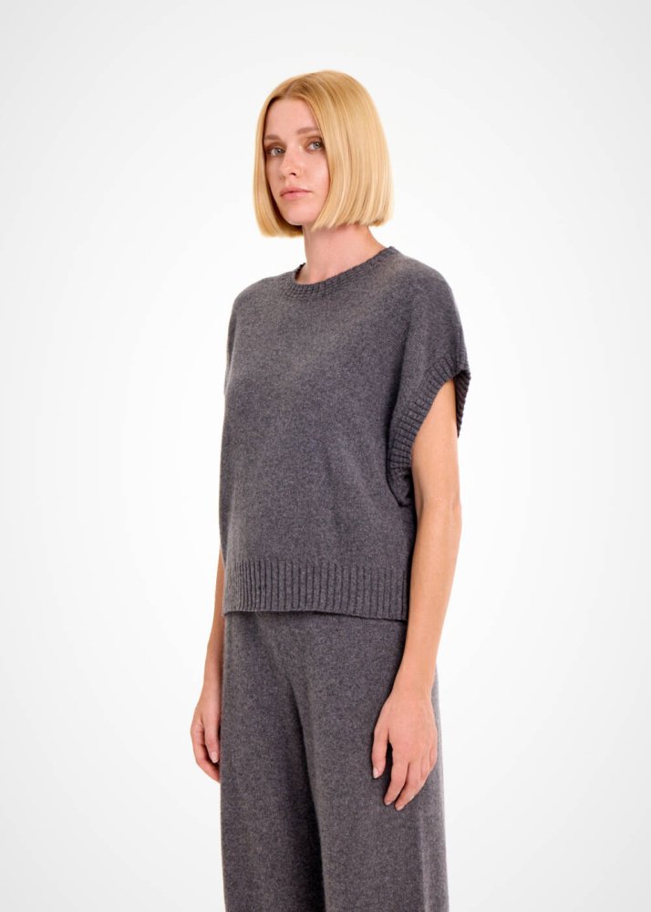 Çağdaş stili ile ilk bakışta seçkin giyim zevkini yansıtan koyu gri kolsuz üst, kaşmir yünlü içeriği ve Knitss’e özgü triko anlayışı ile ayrıcalıklıdır. Yumuşak ve sıcak tutan kaşmirin lüksünü her temasta yaşatan koyu gri triko üst, kısa kollu çağdaş kesimi ve zarif triko örgü detayları ile özgün ve şık kadın kombinleri için idealdir.