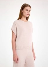 Minimal, zarif ve konforlu… Geri dönüştürülmüş kaşmirden üretilen krem triko üst, Knitss’in çağdaş triko stilini her detayında yansıtan özel bir parçadır. Kaşmirin lüks hissiyatını her temasta yaşatan kolsuz krem üst, çağdaş kesimi ve zarif triko örgü detayları ile sofistike giyim zevkini yansıtır. Knitss koleksiyonundaki birçok parça ile kolayca kombinlenir.