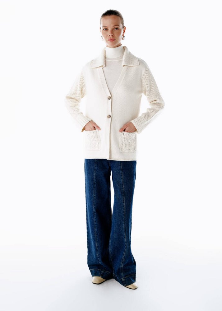 Krem Organik Pamuk Kaşmir Karışımlı Triko Hırka