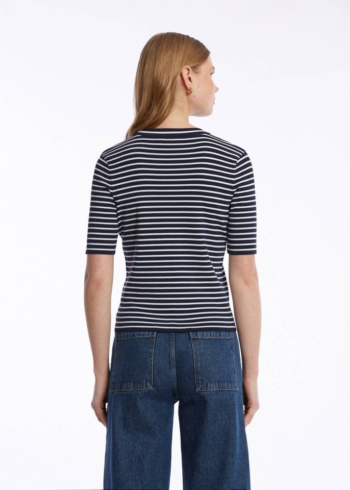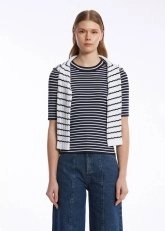 Her kadının yazlık giyim dolabında olması gereken lacivert-beyaz çizgili yarım kollu triko üst, zamansız marin stili ile çok kullanışlıdır. İtalyan ipliklerinden üretilen çizgili yarım kollu üst, günün farklı anlarına kolaylıkla uyum sağlayan klasikleşmiş tarzı ile kurtarıcı bir parçadır. Özenli işçiliği, mükemmel kalıbı ve dayanıklı iplik kalitesi ile uzun yıllar ilk günkü görünümünü korur.