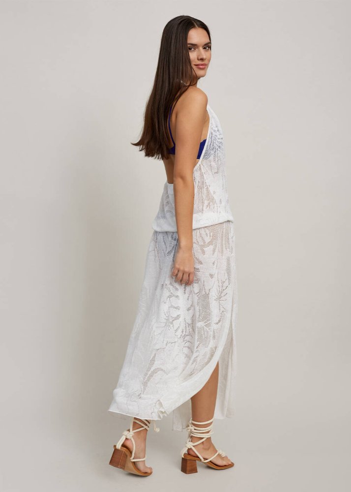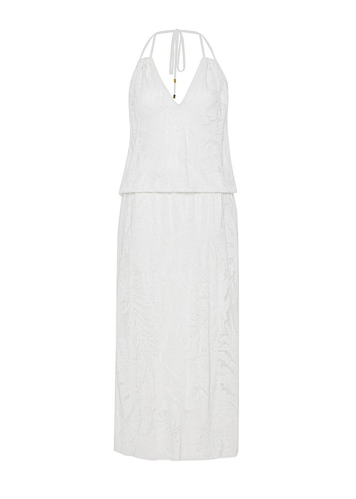 Leaf Patterned Tie Neck White Knit Dress