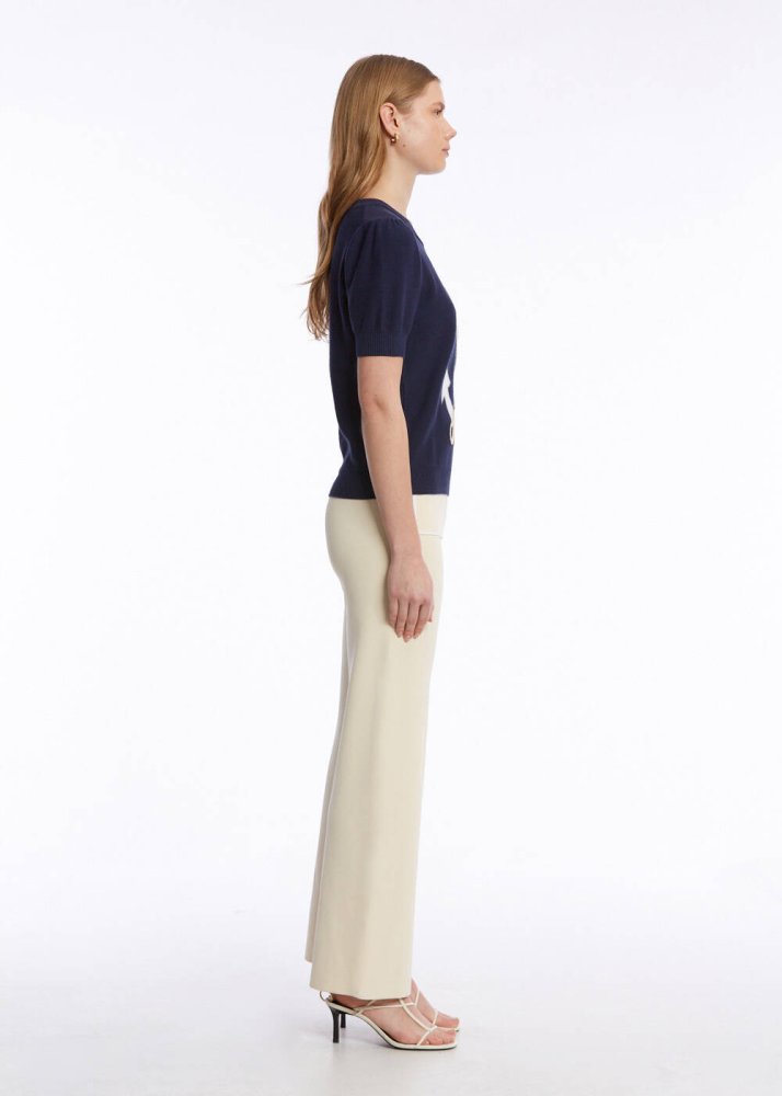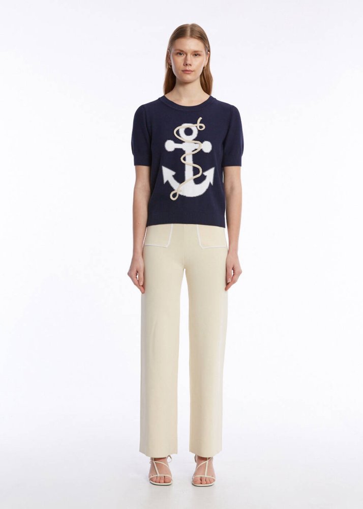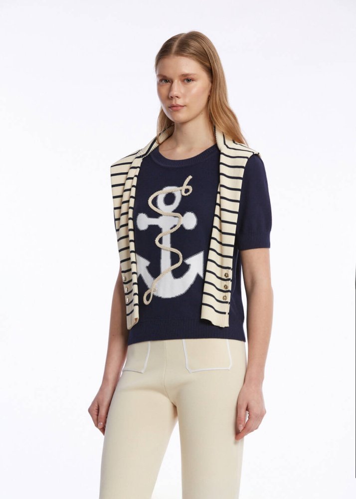 Knitss’in marin temalı koleksiyonuna ait çapa işlemeli yarım kollu triko üst, sofistike stili ile ilk bakışta dikkat çeker. %100 organik pamuklu üst, triko şıklığını ve konforunu yazlık kadın kombinlerine zahmetsizce taşır. Marin rengi ve çapa işlemeli şık deseni ile denizin ılık esintisini ve yazın enerjisini yazlık stilinize taşır.