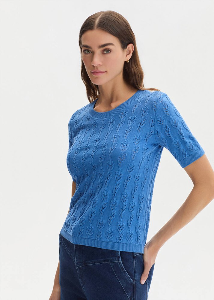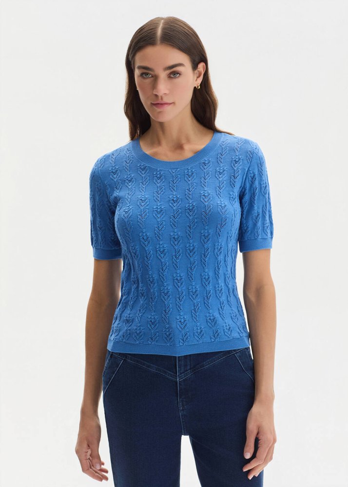 Ajur çiçek desenli dokusuyla hareket kazanan triko üst, %100 organik pamuk içeriği sayesinde doğal, nefes alabilen ve yumuşak bir kullanım sunar. Kısa kol ve yuvarlak yaka formu tasarımı sade bir çerçeveye oturturken, mavi tonunun enerjisi görünüme canlı ve taze bir karakter kazandırır. Günlük kombinlerde konforlu ve zamansız bir şıklık sağlar.