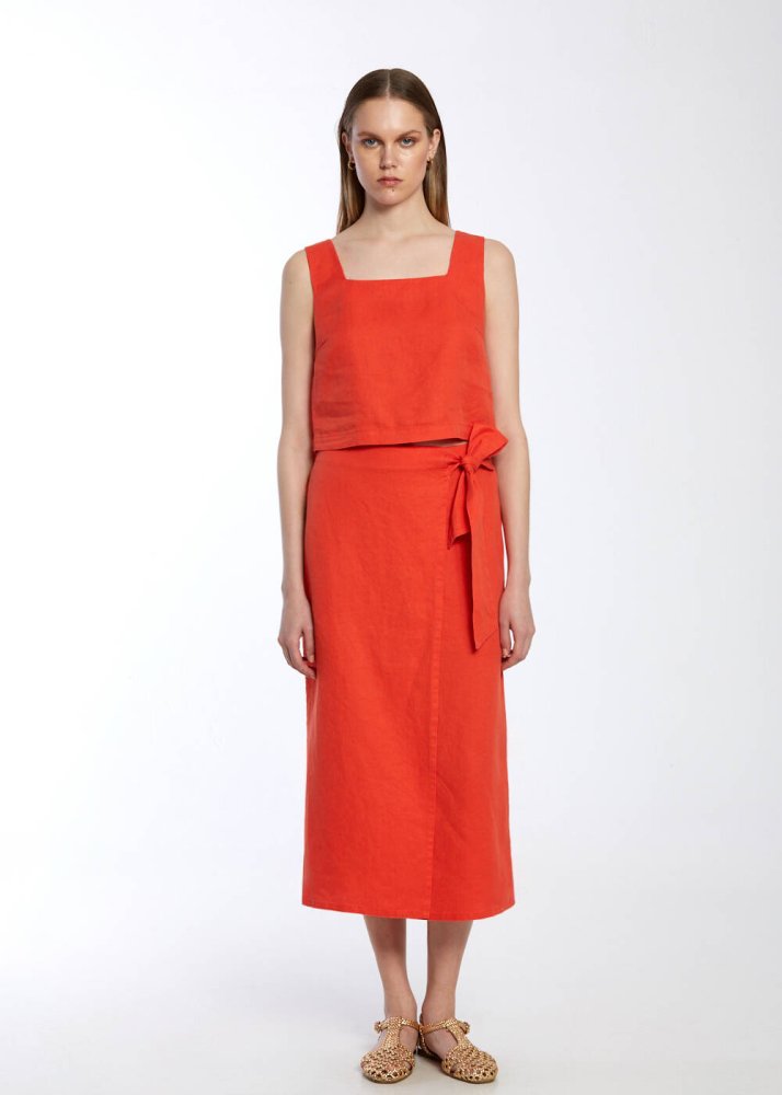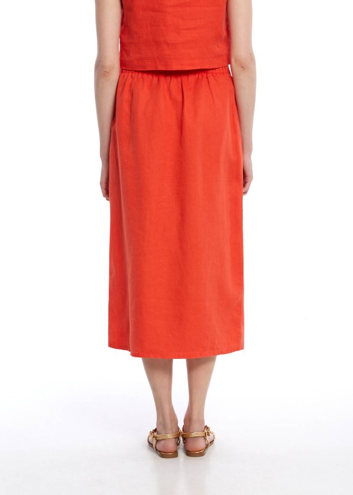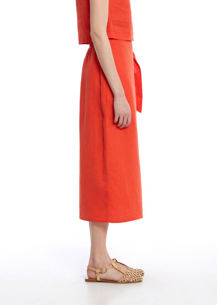 Mercan keten etek, saf keten kumaşının teni okşayan hafifliği ve nefes alabilir dokusu sayesinde yaz sıcaklarında bile gün boyu eşsiz bir konfor sunar. Modern kesimi ve bel kısmındaki özenle tasarlanmış bağlama detayı, feminen silueti zarifçe vurgularken; canlı rengiyle her ortamda dikkat çeken, güçlü bir stil yaratır. Düz kesimi ve midi boyuyla hem şehirde hem tatilde şıklığını konuşturmak isteyenler için zamansız ve etkileyici bir parça.