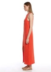 Mercan renginin sıcak ve canlı tonu, enerjik ve stil sahibi bir görünüm sunuyor. Kolsuz tasarımı ve rahat kesimi, özellikle sıcak havalarda konfor sağlarken, şık bir duruş sergiliyor. Ön ortasında yer alan dikiş detayı, elbiseye zarif bir dokunuş katıyor. Etek ucundaki yırtmaç ise hareket özgürlüğü sunarken, feminen bir hava katıyor. İster özel bir etkinlikte, ister şık bir yaz akşamında tercih edebileceğiniz mercan rengi keten elbise, doğal güzelliğinizi ve stilinizi ön plana çıkaracak.
