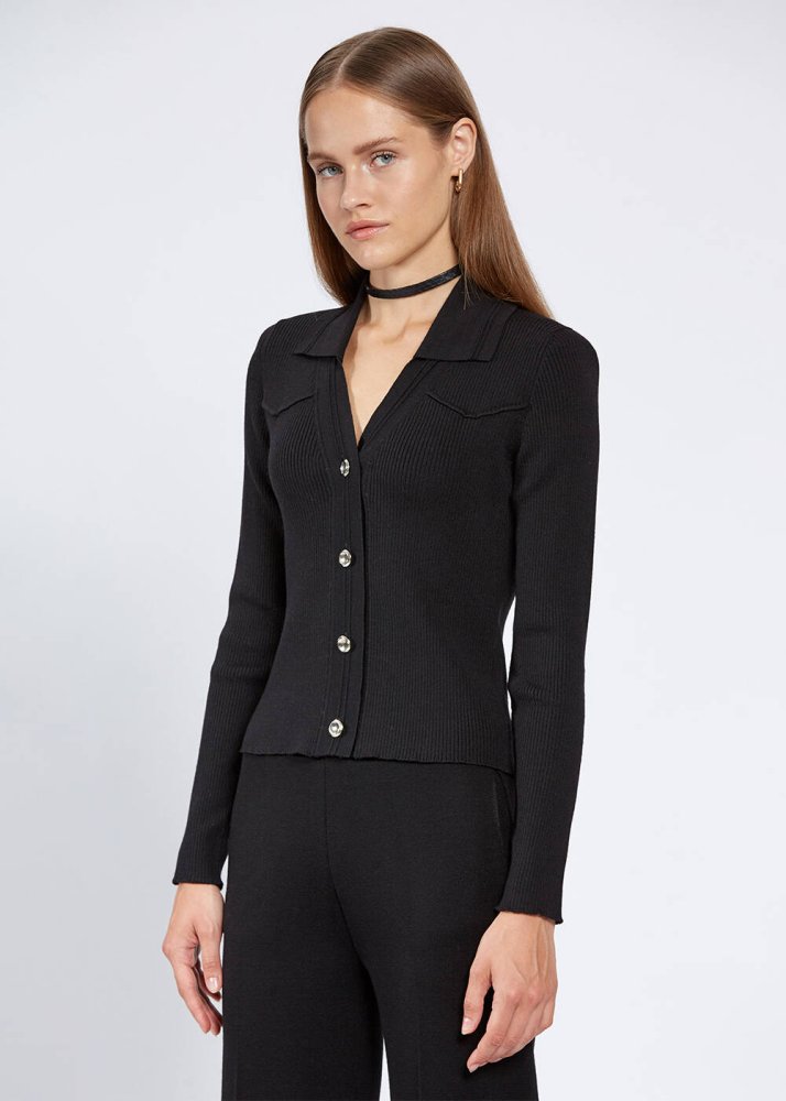 MERINO WOOL BLACK KNIT TOP METALLIC BUTTONS