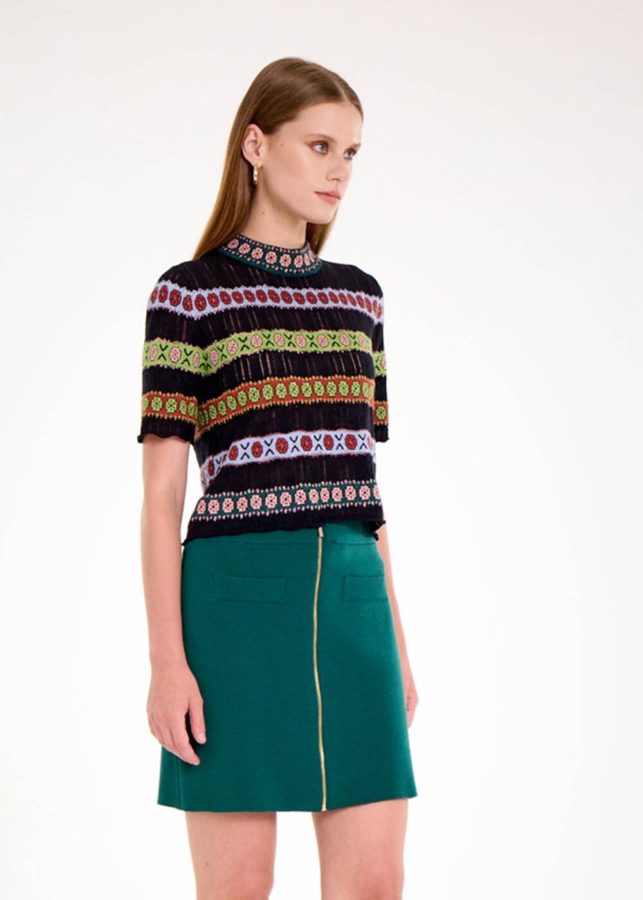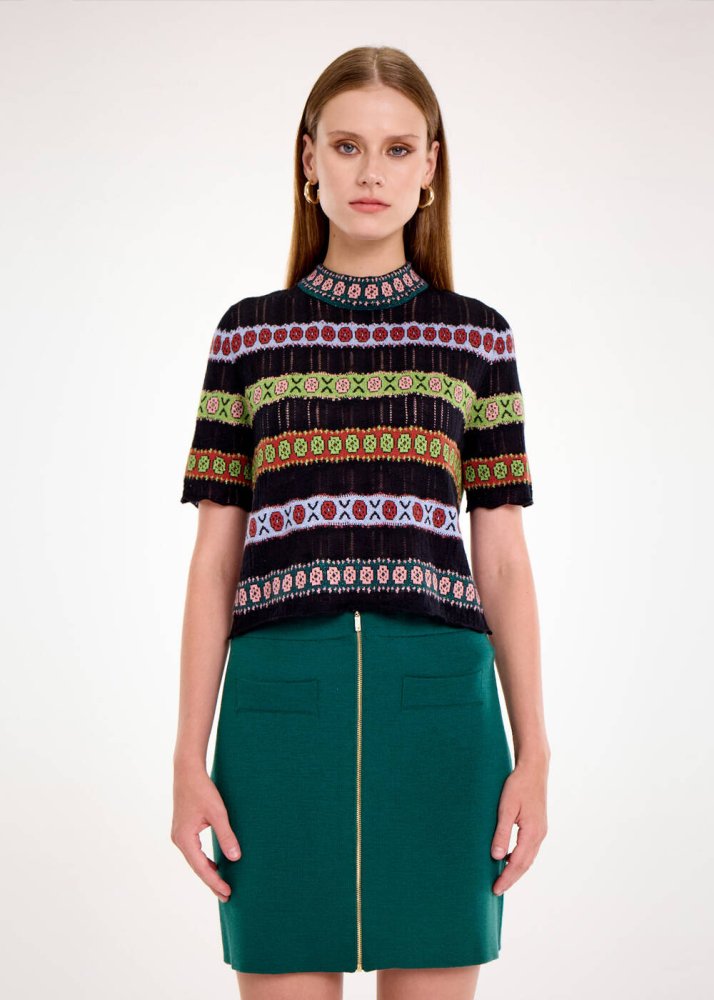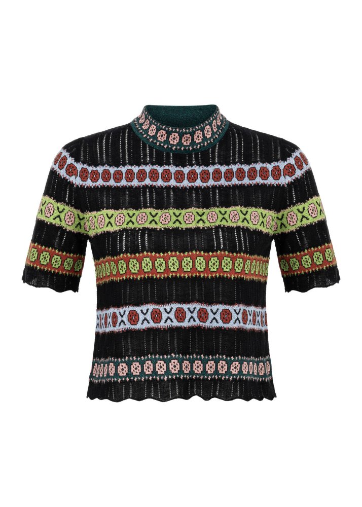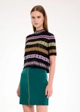 Çarpıcı renk ve desen kombinasyonunu Knitss’e özgü usta örgü tekniği ile buluşturan kısa kollu triko üst, özgün zevklerini giyimine yansıtan kadınlar için üretildi. İnce ve nefes alan merino yün karışımlı İtalyan iplik içeriği ile üst düzey giyim deneyimi sunan kısa kollu desenli crop triko üst, çok özel örgü tekniği ve sanatçı duyarlılığı ile tasarlanan deseni ile ayrıcalıklı kombinler vadediyor.