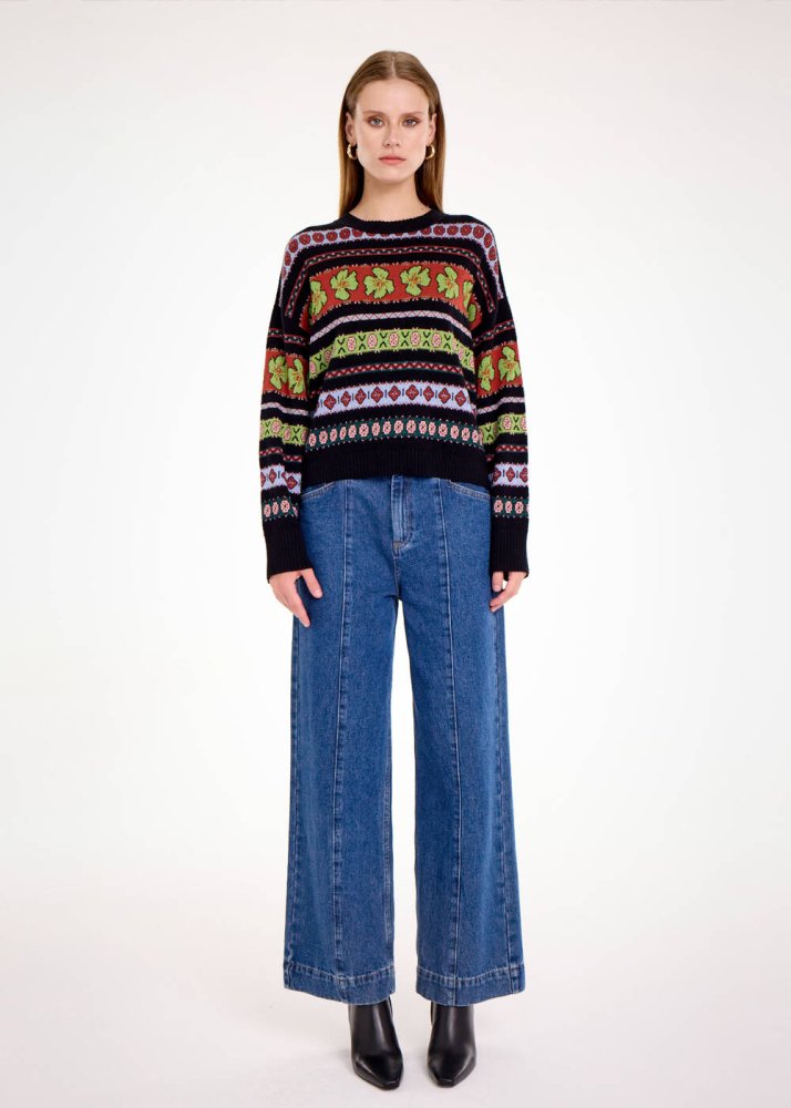 Doğadan aldığı ilhamı çağdaş geometrik desenlerle ve cesur renklerle buluşturan Knitss’in bu desenli kazağı ile kış kombinlerinize yenilik katın. Merino yün karışımlı İtalyan iplik içeriği ile üst düzey giyim deneyimi sunan desenli kazak, düşük omuzlu bol kesim modeli ile rahat ve özgür bir stil vadediyor. İlk temastan itibaren merino yününün doğal kalitesini hissedeceğiniz desenli kazakla renkli ve neşeli ruhunuzu giyiminize yansıtın.