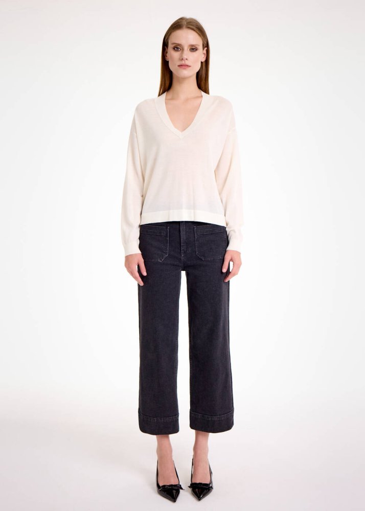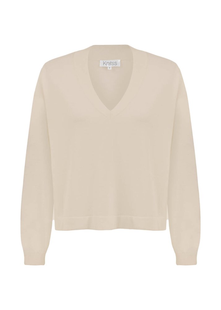 V yaka bol kesim ekru kazak, merino yün karışımlı İtalyan ipliklerinden üretildi. Doğallığı ve minimal şıklığı bir arada sunan ekru kazak, spor-şık kombinlere zahmetsizce uyum sağlar. Nefes alan doğal merino yününün konforunu ilk giyişten itiabren hissettirir, uzun yıllar giyim dolabınızın kurtarıcı parçalarından olmaya adaydır.