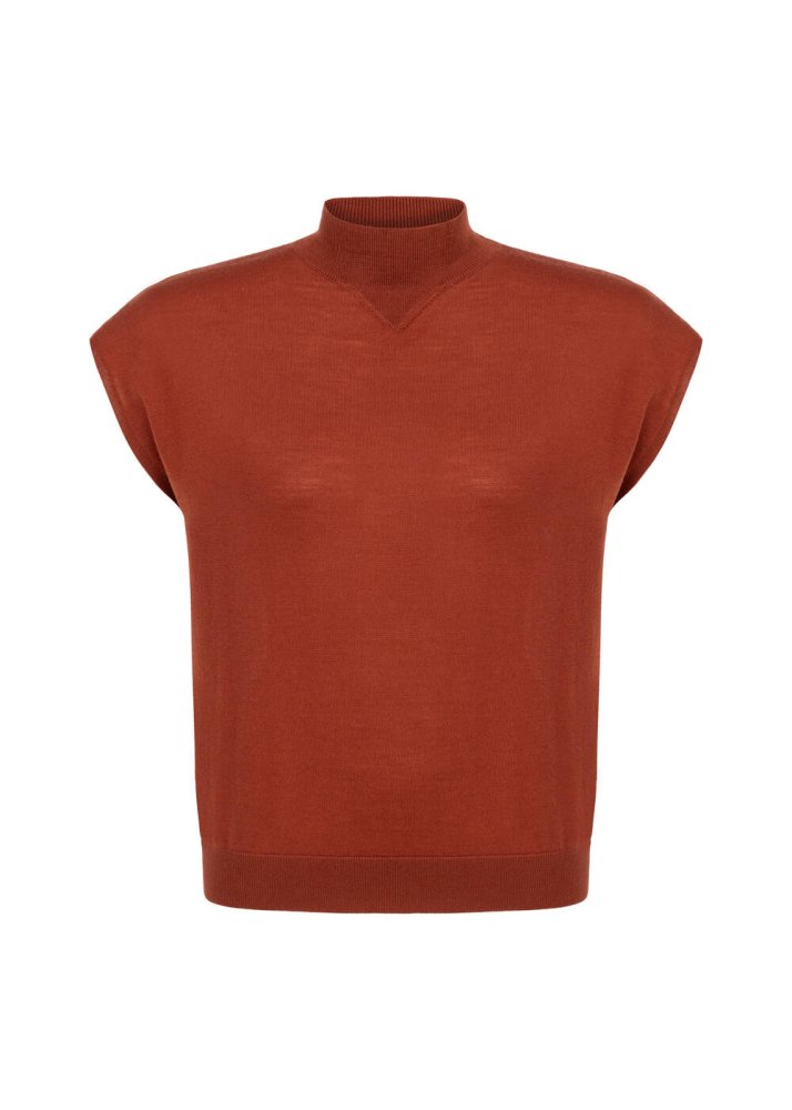 Knitss trikolarının çağdaş stilini ve zarafetini yansıtan kiremit rengi yarım balıkçı kolsuz triko üstle stilinizde fark yaratın. İncecik merino yünlü dokusu sayesinde dökümlü duran kolsuz triko üst, çağdaş kadın giyim kombinlerine çok yakışan özgün tasarımı ile dikkat çeker. Ofis giyimden şık davetlere, günün her anına kolayca uyum sağlar.