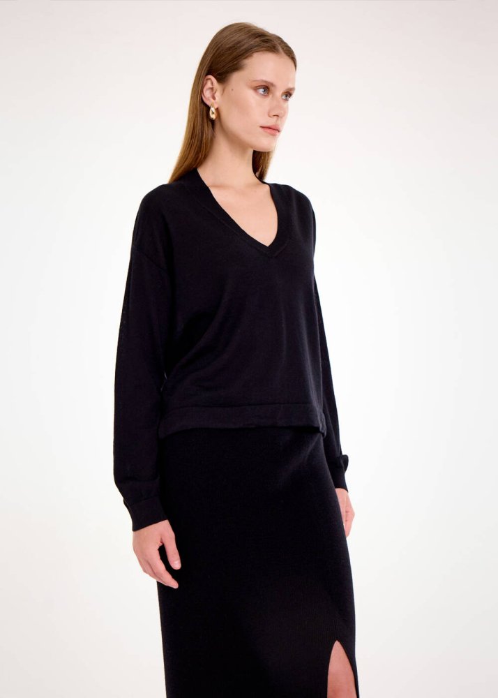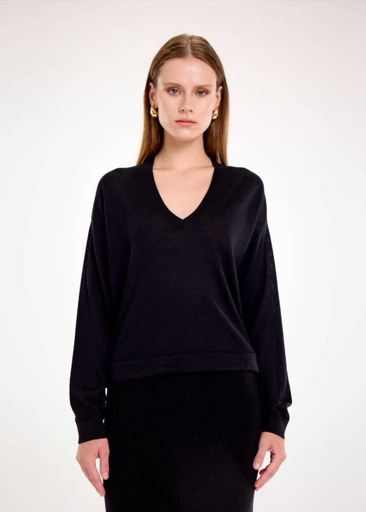 Bol kesim v yaka siyah kazak, merino yün karışımlı İtalyan ipliklerinden üretildi. Nefes alan doğal yünün terletmeden ısıtan yapısı sayesinde gün boyu konfor sunan siyah kazak, bol kesim salaş stili ile çağdaş kadın giyim kombinlerine zahmetsizce uyum sağlar. Hem spor hem şık kombinlerle eşleştirebileceğiniz zamansız bir parçadır.