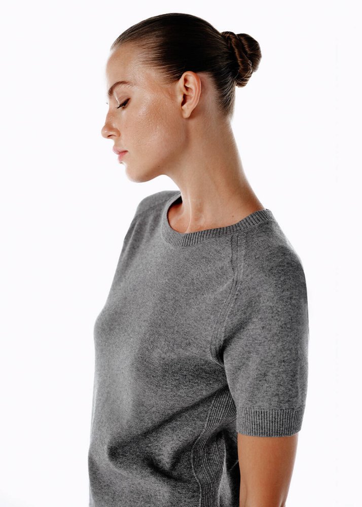 Zarif bir şıklık: Gri merino yün karışımlı triko üst, kısa kollu formuyla dinamik bir görünüm sunuyor. İtalyan ipliğinin ince işçiliği sayesinde, üstte duruşu akıcı ve hafif. %50 FSC viskon, %30 poliamid ve %20 merino yün karışımı ise hem nefes alan hem de uzun ömürlü bir kullanım vadediyor. Şehrin temposuyla uyum gösteren bu parça, rahatlığından ödün vermeden şıklık arayan kadınlar için seçkin bir konfor sağlıyor.