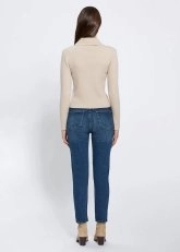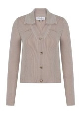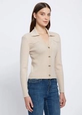 Vücuda tam oturan kalıbı, metalik düğme detayları, omuzdan destekli modeli ile kusursuz bir görünüm sunan natürel renkteki uzun kollu V yaka triko üst, gündüzden geceye şıklık sağlayan zamansız bir kombin tamamlayıcısıdır. İnce Merino yünü ve ertifikalı geri dönüştürülmüş İtalyan iplikten üretilen triko üst, çevreye duyarlı bir modacılık anlayışının zarif bir temsilcisidir.