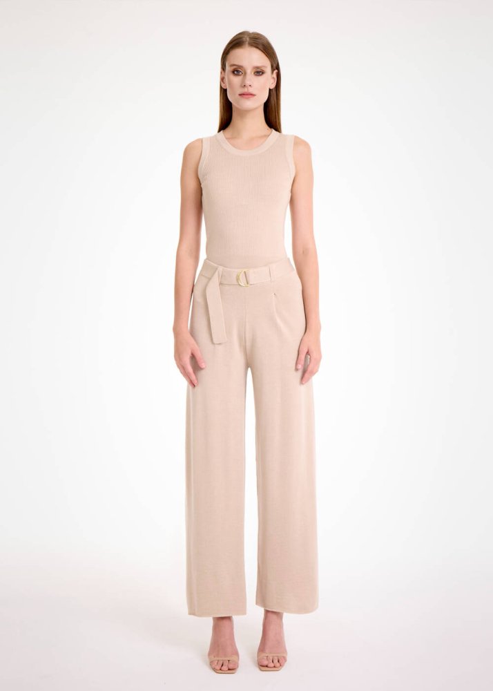 Kışlık gardırobunuzun kurtarıcı parçalarından olacak pileli triko pantolon, natürel rengi ve kendinden kemerli modeli ile çok şıktır. Konforu ön planda tutan çağdaş minimal tasarımı ile triko şıklığını buluşturan pileli pantolon, ince Merino yünü ve geri dönüştürülmüş İtalyan iplik içeriği ile sürdürülebilir modanın zarif bir temsilcisidir.