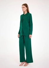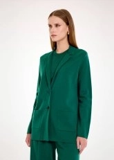 Çarpıcı rengi ve çağdaş kesimi ile fark yaratan malakit yeşili triko blazer ceket, Knitss’in özgün stilini kombinlerinize taşır. İnce ve nefes alan Merino yününe eşlik eden sertifikalı geri dönüştürülmüş İtalyan iplik karışımlı içeriği ile ayrıcalıklıdır. Rahatlığı ön planda tutan düz kesimi ve mücevher düğmeleri ile yenilikçi ve zariftir.