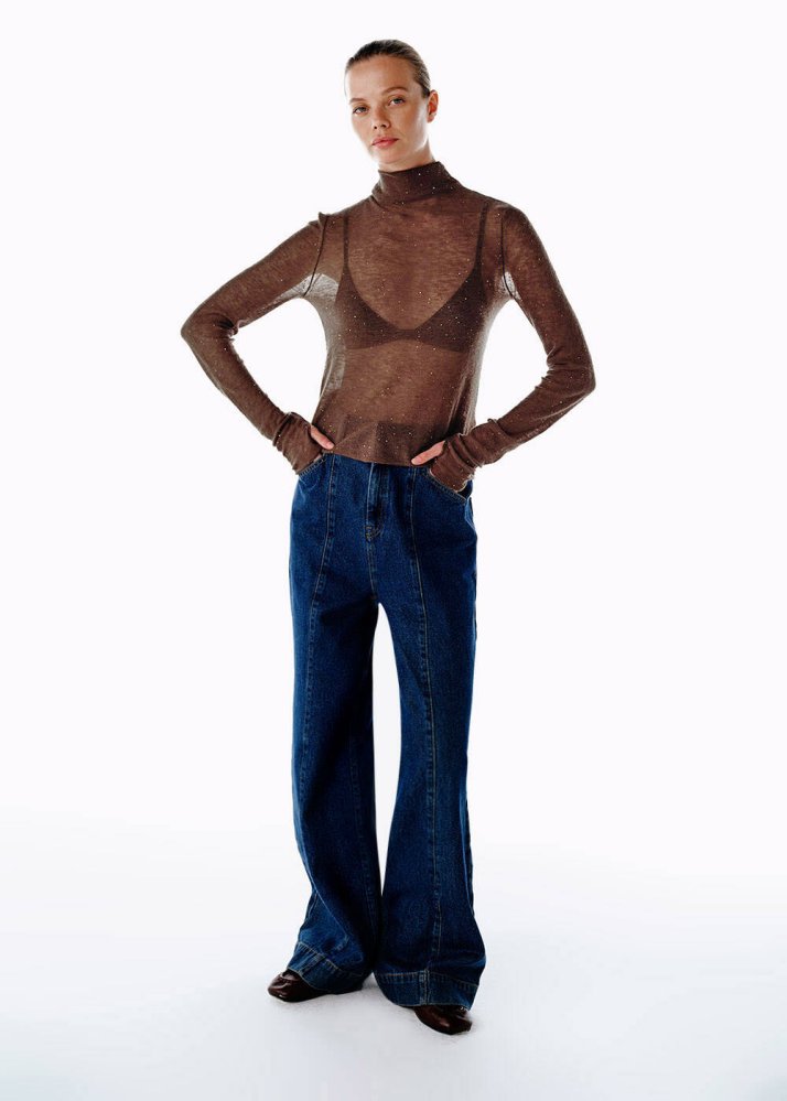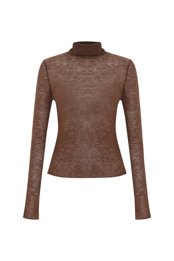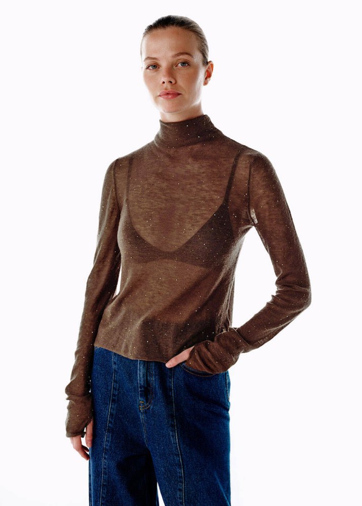 Knitss’in ışıltılı dokunuşlarla yorumladığı micro payetli extrafine yün triko, bronz rengiyle güçlü ama zarif bir duruş sergiler. İtalyan iplikten üretilen bu model, RWS sertifikalı yünün doğallığını ve payetlerin sofistike parıltısını bir araya getirir. İnce dokusu sayesinde hem şık hem konforlu bir deneyim sunar. Uzun kollu tasarımıyla vücuda zarifçe oturur, sade ama dikkat çekici bir görünüm yaratır.