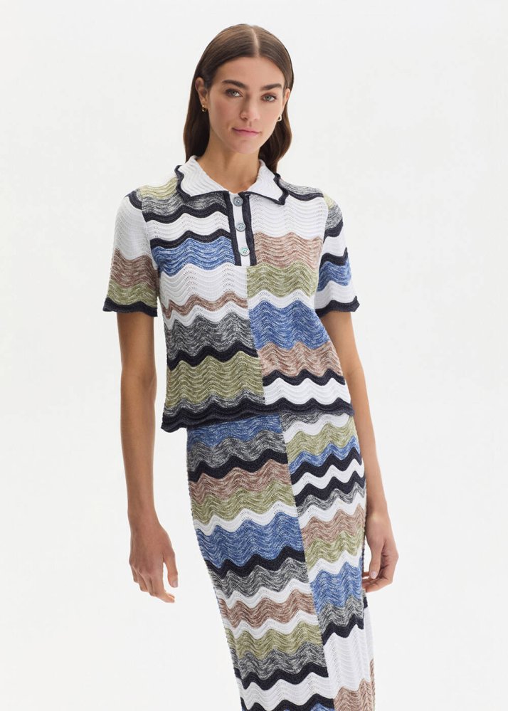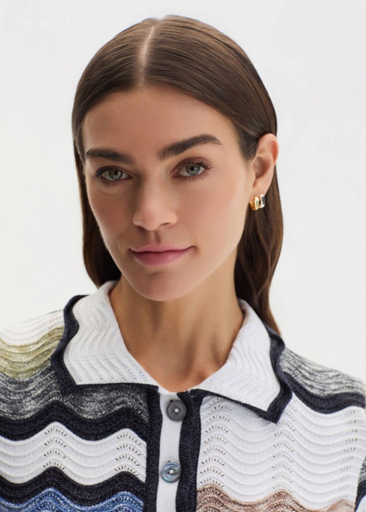 Muline Organik Pamuk Çok Renkli Triko Üst, dalgalı intarsia desenleriyle grafiği güçlü bir triko yorumudur. İtalyan ipliklerle ve organik pamuk içeren özel karışımla örülen yapısı formunu koruyan, dengeli bir triko dokusu sunar. Polo yaka ve düğmeli tasarım klasik bir çizgi oluştururken, kısa kollu formu günlük stil için rahat bir siluet yaratır.