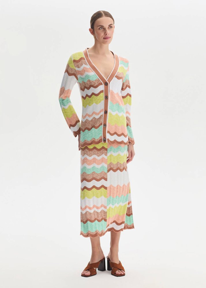 Muline Organik Pamuk Soft Candy Triko Etek, pastel tonların dalgalı intarsia desenle buluştuğu enerjik bir tasarıma sahiptir. İtalyan ipliklerle ve organik pamuk içeren özel karışımla örülen triko yapısı dengeli bir form sunar. Elastik beli gün boyu konfor sağlarken, yırtmaç detayı eteğin hareketli yapısını vurgular. Aynı desene sahip triko üstlerle takım olarak kombinlenebilir.