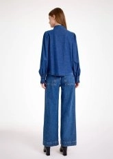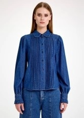Her detayında Knitss özgünlüğünü göreceğiniz mavi denim gömlek, özgün stili ile fark yaratıyor. Büzgülü kolları, işlemeli manşetleri, nostaljik bebe yaka modeli ve nervür detayıyla sıradan bir kot gömleğin çok ötesine geçen tasarım, %100 pamuk kumaşı ile konforu sofistike giyim zevkiyle buluşturuyor.