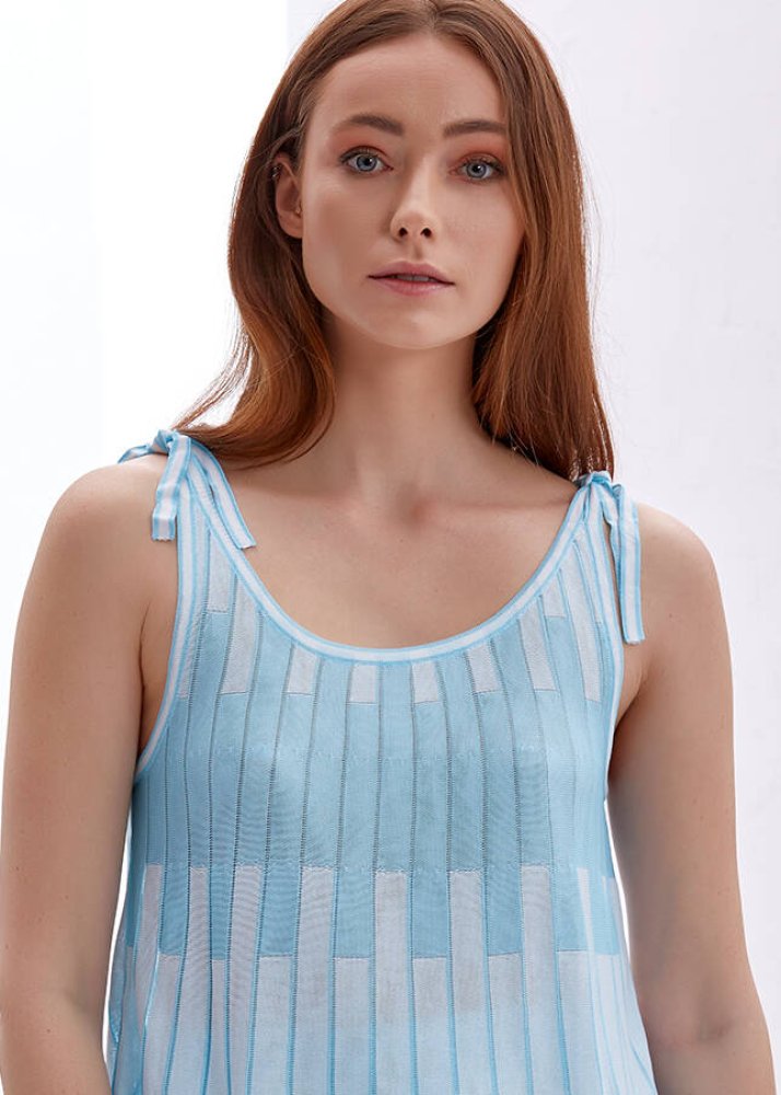Omzu Bağcıklı Mavi Desenli Triko Üst