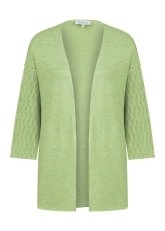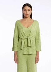 Canlı yeşil tonu ve önden bağlama detayıyla modern bir zarafet sunan yeşil triko hırka, yumuşak dokusu ve özgün tasarımıyla stilinizi tamamlar.