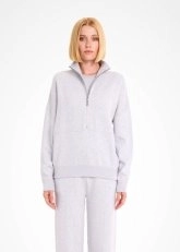 Minimal çizgilerle rahat ve şık spor kombinler yaratmayı seven Knitss kadınları için üretilen açık gri fermuarlı triko, organik pamuklu sürdürülebilir iplik içeriği ile ayrıcalıklıdır. Nefes alan organik pamuğun ekstra konfor sunan oversize kalıpla ve çağdaş stille birleştiği düşük omuzlu açık gri kazak, trikonun şıklığını ev ve spor kombinlere zahmetsizce taşır.