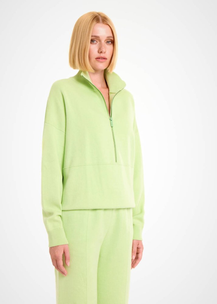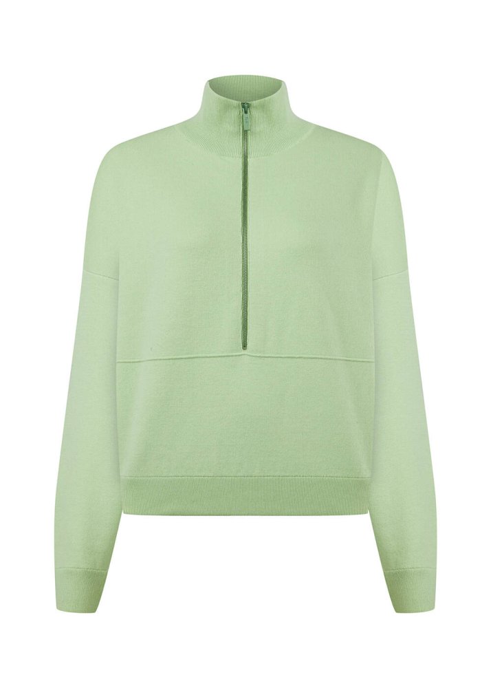 Organik pamuklu açık yeşil fermuarlı kazak, kadın spor ve ev kombinlerine rahatlık ve şıklığı bir arada sunar. Nefes alan doğal yüzeyin bol kesimle buluştuğu triko kazak, gün boyu maksimum konfor sağlar. Düşük omuzlu yarım fermuarlı minimal tasarımı ile çağdaş ve dinamik stildeki triko kazak, açık yeşil rengi ile de spor kombinlerinize taptaze bir enerji getirir.