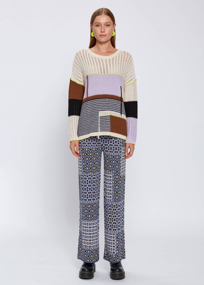 %100 organik pamuklu renk bloklu kazak, Knitss’in özgün stilini kombinlerinize taşır. Pointel örgü, püskül detayı ve çağdaş renk bloklu tasarımıyla sanatsal bir anlayışın temsilcisi olan triko kazak, GOTS sertifikalı saf pamuk içeriği ile de birinci sınıf kalitededir, sürdürülebilir modacılık ilkelerine göre üretilmiştir.