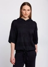 Kapüşonlu lacivert triko üst, %100 organik pamuktan üretilmiş olup yumuşak ve ince yapısı ile gardırobunuzun favorileri arasında yerini alacaktır. Beli bağcıklı yapısı ile konforlu bir kullanım sunan triko üst, sportif hafta sonu kombinlerinize Knitss şıklığı katar.