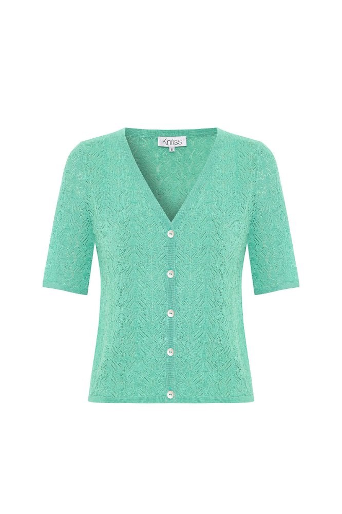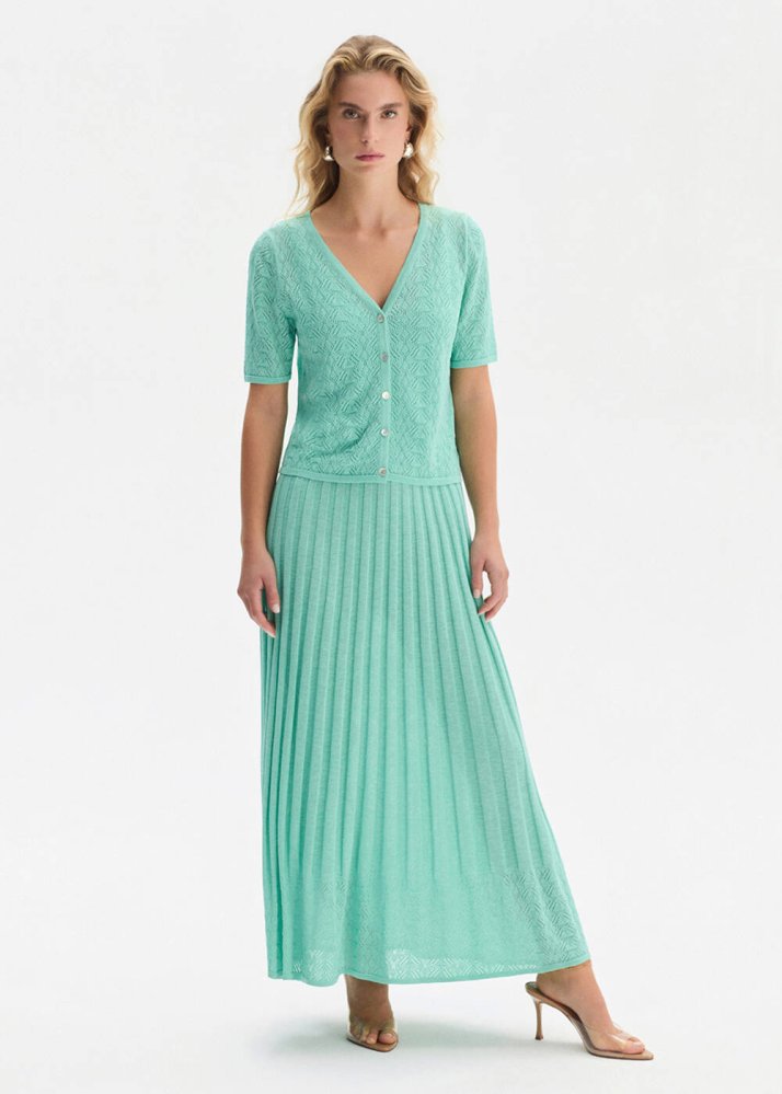Organik Pamuk Karışımlı Su Yeşili Triko Hırka, mint tonunun ferah etkisini ince dokulu yüzeyiyle buluşturur. V yaka detayı ve dengeli kesimiyle gün boyu rahat bir kullanım sunarken, hafif yapısıyla katmanlı kombinlere eşlik eder. Organik pamuk karışımıyla, modern ve duyarlı bir yaklaşımı yansıtır.