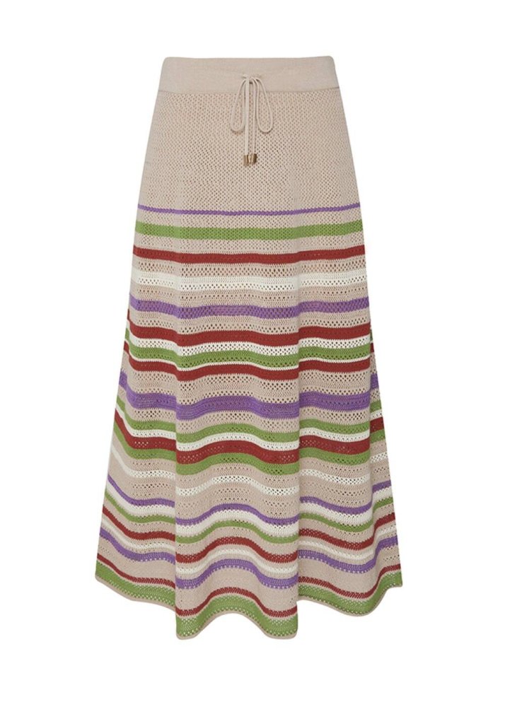 Cesur renk paleti ile dikkat çeken çizgili bej triko etekle yazlık kombinlerinize Knitss farkını taşıyın. Organik pamuk ve keten karışımlı İtalyan iplik içeriği ile sürdürülebilir modacılık ilkelerine uygun olarak üretilen maxi triko etek; pointel dokulu çizgili triko kumaşı, iç göstermeyen yarım astarı, büzgülü kuşaklı lastikli beli ile konforu ön planda tutan capcanlı ve özgür bir yazlık stil sunar.