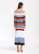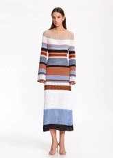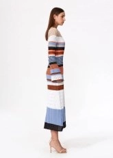 Triko şıklığını tek parçada yazlık kombinlerinize taşıyacak çizgili maxi boy elbise, çağdaş renk kombinasyonu ve pointel detaylı dokusu ile ilk bakışta dikkat çeker. Organik pamuk ve keten gibi sertifikalı İtalyan iplik karışımlı içeriği ile sürdürülebilir giyim prensiplerine uygun olarak üretilmiştir. Konforu ön planda tutan gündüzden geceye şıklık için idealdir.