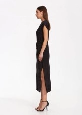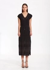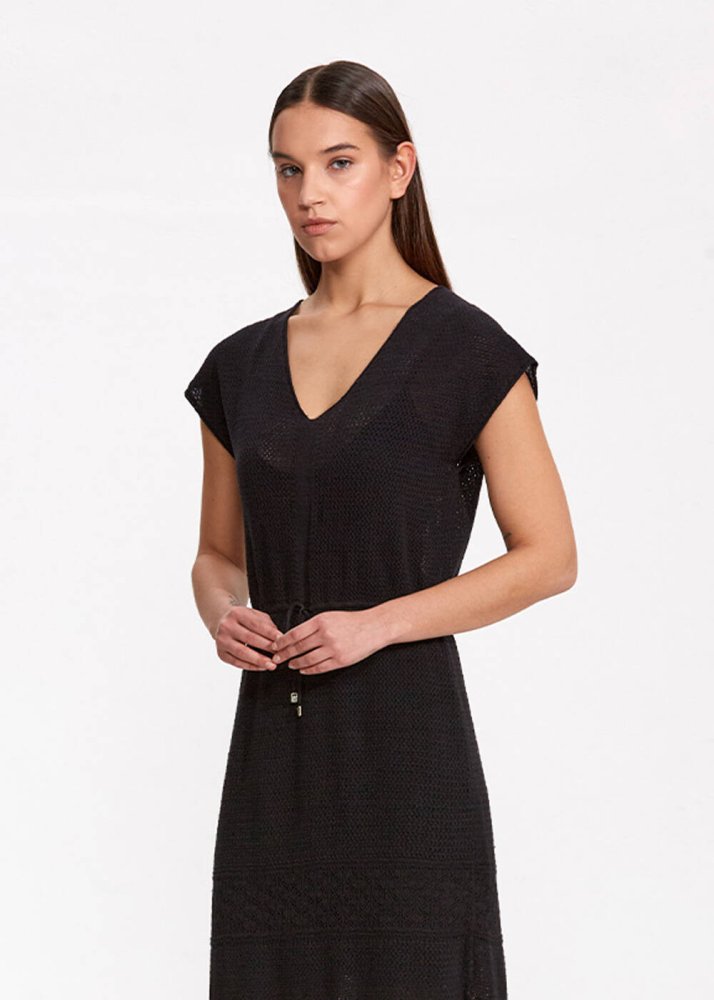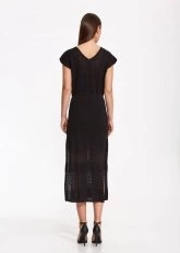 Hem konforlu hem şık, hem gündüz hem gece kombinlerine zahmetsizce uyum sağlayan siyah triko elbise, keten karışımlı organik pamuk ipliği ile doğal şıklıktadır. V yaka yarım kollu belden ipli siyah triko elbise, zarif örgü deseni ve yırtmaç detayı gibi Knitss’e özgü dokunuşları ile tek parçada kusursuz görünüm vadeder.