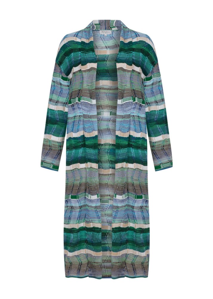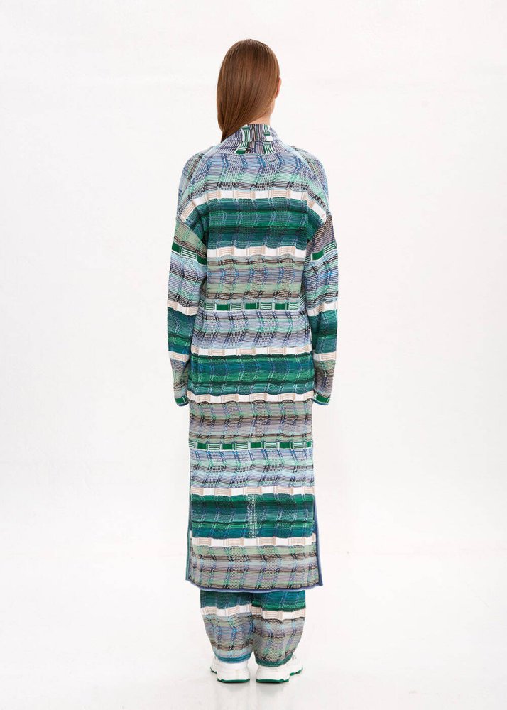 Doğadan aldığı ilhamı özgün çağdaş stili ile harmanlayan Knitss, yeşil-mavi tonlarındaki bu uzun hırkayla sofistike bir yazlık stil müjdeliyor. Organik pamuk ve keten ipliklerinden üretilen yanları yırtmaçlı uzun triko hırka, renklerin harmonik dansı ve triko işçiliğinin zarafeti ile ilk görüşte hayranlık uyandırıyor. Doğal, konforlu ve stil sahibi giyinmenin keyfini bu hırkayla sürün.