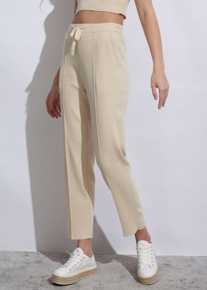 Zamansız krem rengi ile bu yaz sportif kombinlerinizin ideal kombin tamamlayıcısı olacak triko pantolon ile tanışın. Tamamen organik pamuktan üretilen kadın triko pantolon modeli, kendisi için en iyisini isteyen Knitss kadınlarına rahat kalıbı, belden lastik ve yan cep detayı ile konforu ve şıklığı bir arada sunuyor.
