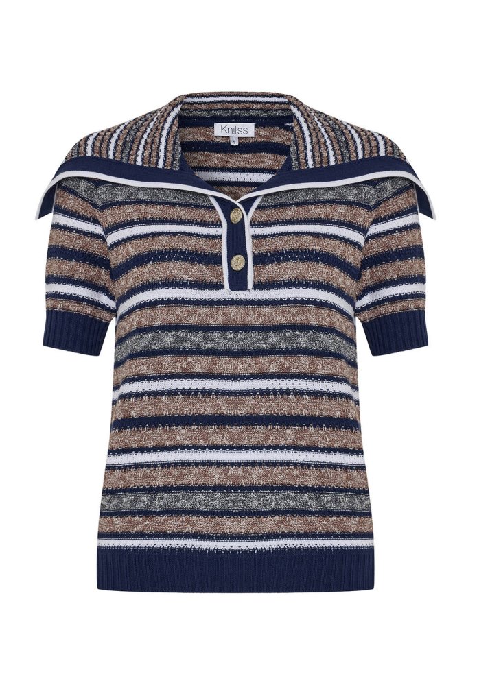 Portland Organik Pamuk Marin Nakışlı Triko Üst, çizgili deseni ve deniz temalı nakış detayıyla zamansız bir stil sunar. Geniş yakası ve düğmeli formu klasik görünümü modern bir dokunuşla tamamlar. Organik pamuk içeriği sayesinde konforlu, günlük kombinlerde öne çıkan rafine bir parçadır.