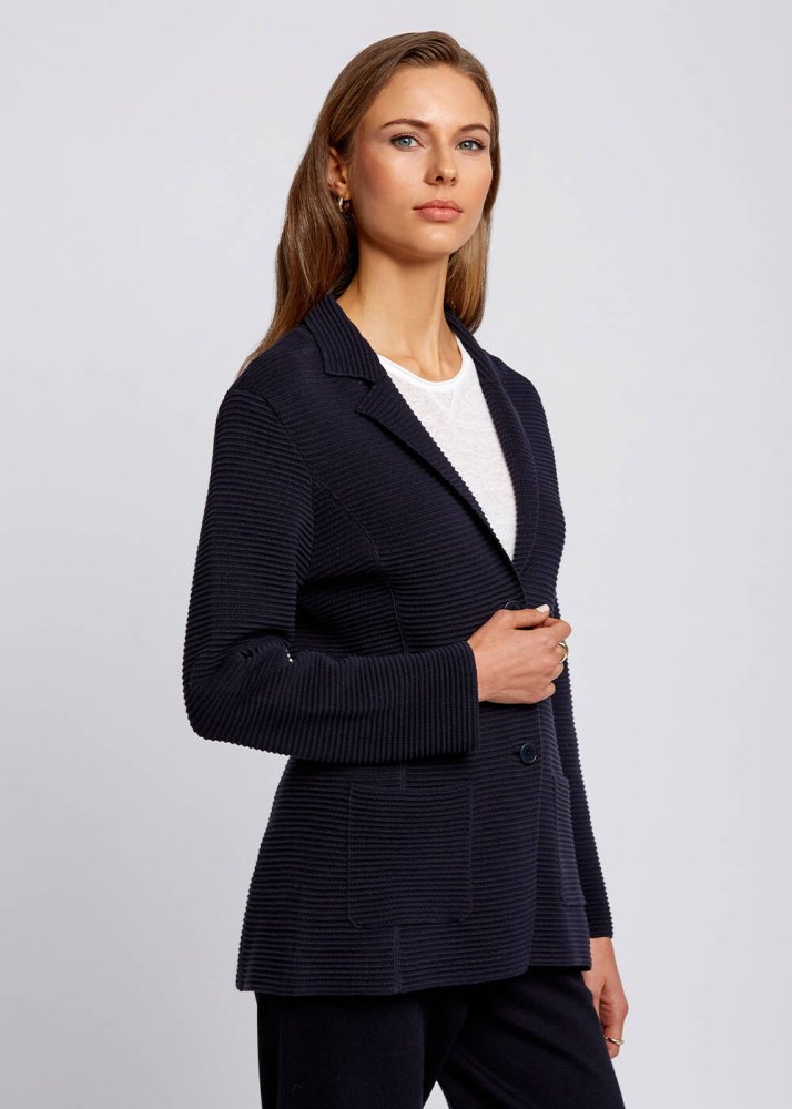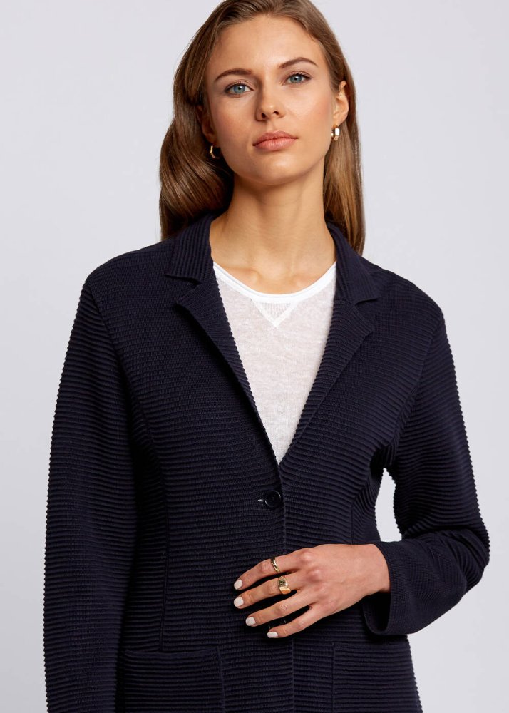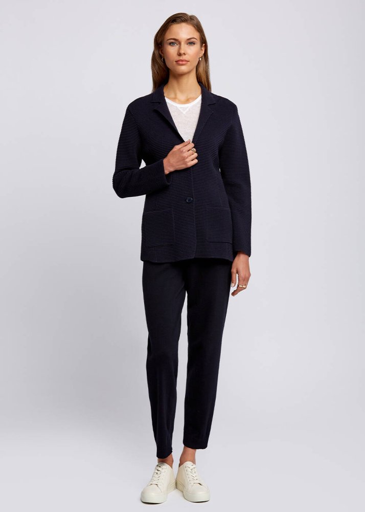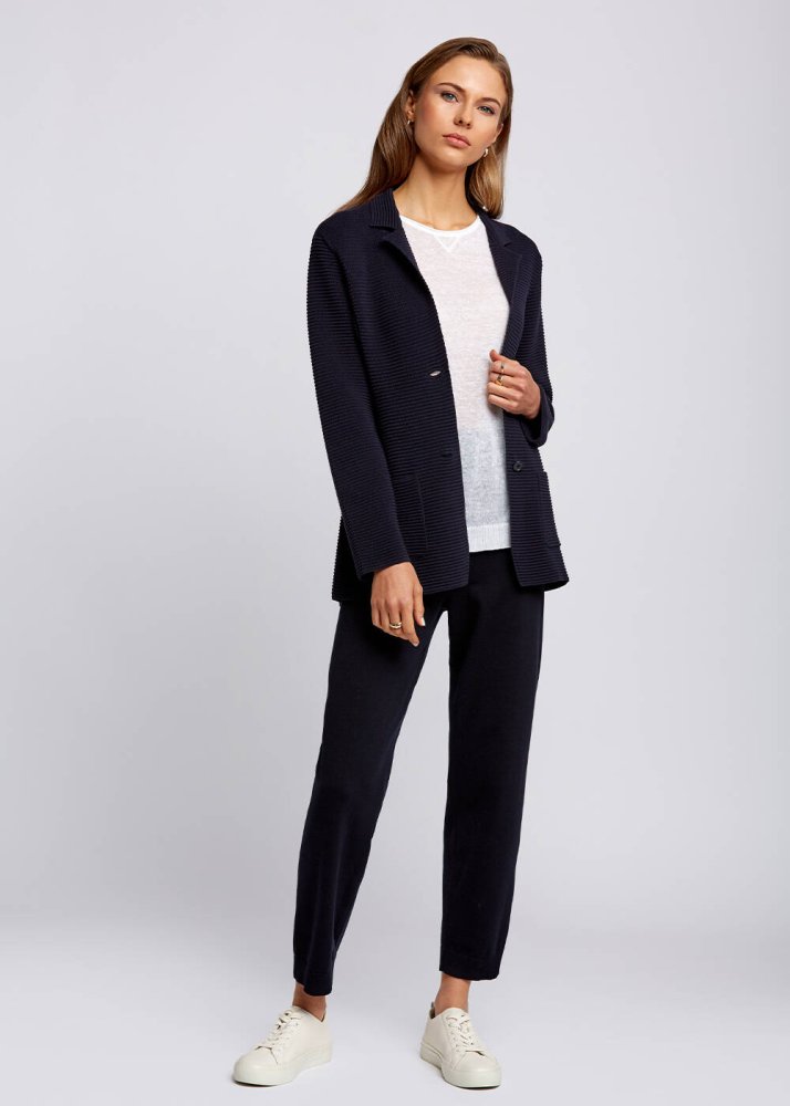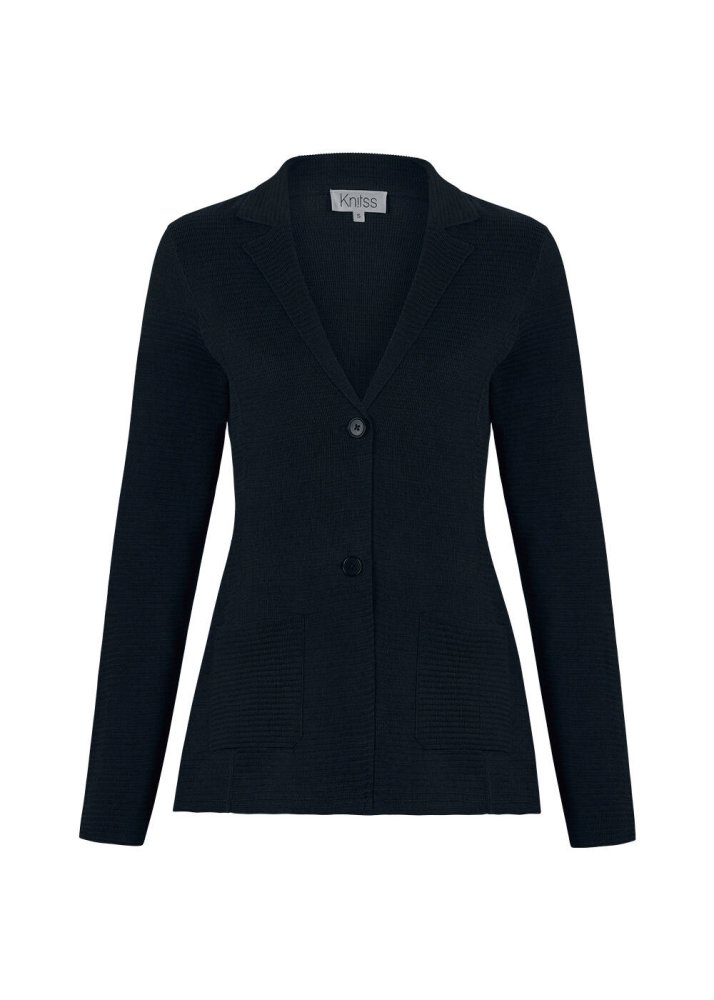 Çevreye duyarlı Knitss kadınları için GOTS sertifikalı organik pamuk iplikten üretilen triko ceket, business stilinize uygun lacivert rengi ile gardırobunuzun hem favori hem de kurtarıcı parçalarından olacaktır. Özel örgü deteya ve yumuşak, nefes alan yapıya sahip kadın triko blazer ceket modeli, koleksiyonun diğer parçaları ile kombinlenerek hafta içi ve hafta dışı stilinize konfor ve şıklık katar.