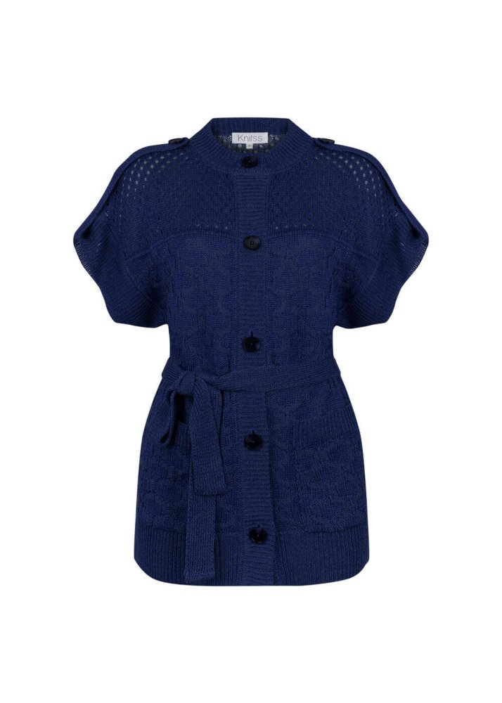 Apolet detayı ve zamansız lacivert rengi ile yazlık dolabınızın favorisi olacak kısa kollu triko hırka ile tanışın. Örgü detaylı kadın triko hırka modeli, içerdiği keten karışımı sayesinde serin bir giyim deneyimi sunar. Düğme kapamalı triko hırka, ofis ve hafta sonu stilinize uygundur.