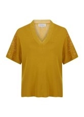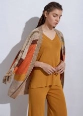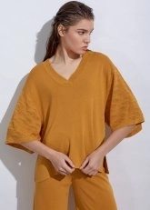 Oversize kalıbı ile konforlu bir giyim deneyimi sunan v yaka triko üst, örgü ve yırtmaç detayı ile kombinlerinize Knitss şıklığı katar. FSC sertifikalı viskon elyaflardan üretilen sarı triko üst modeli, ofis ve hafta sonu stilinize kolaylıkla uyum sağlar.